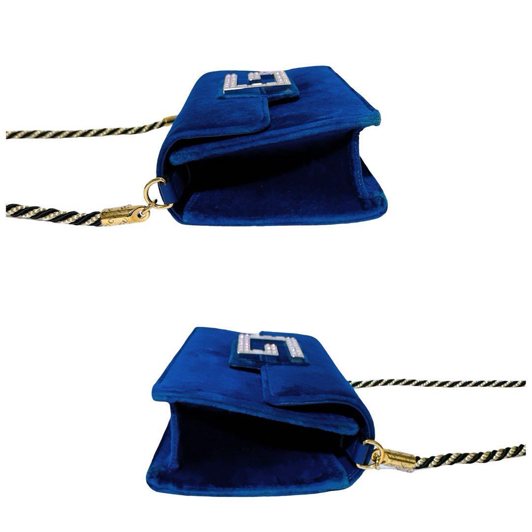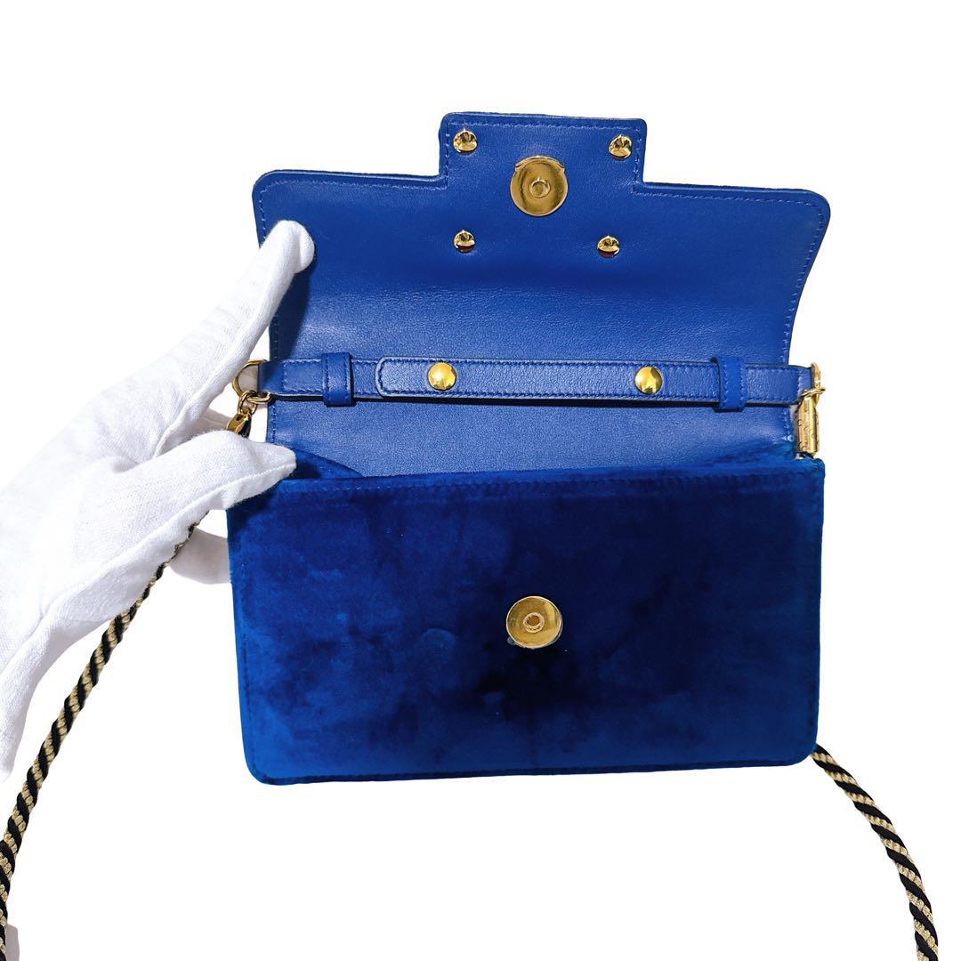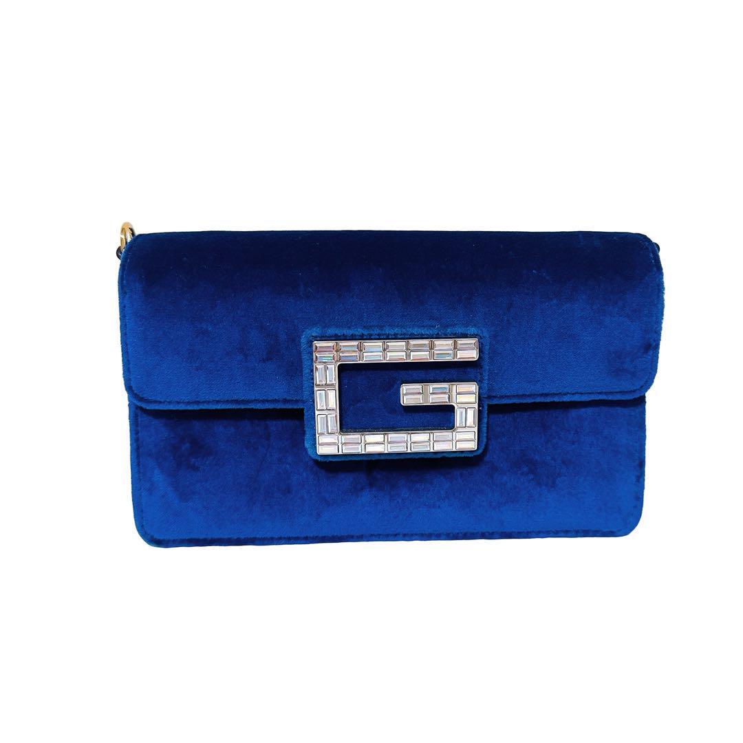 鮮やかなブルーベロアに、存在感のある「スクエアG」ロゴが映えるエレガントなバッグ。