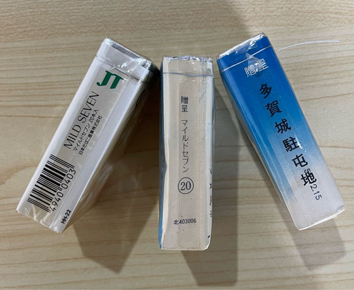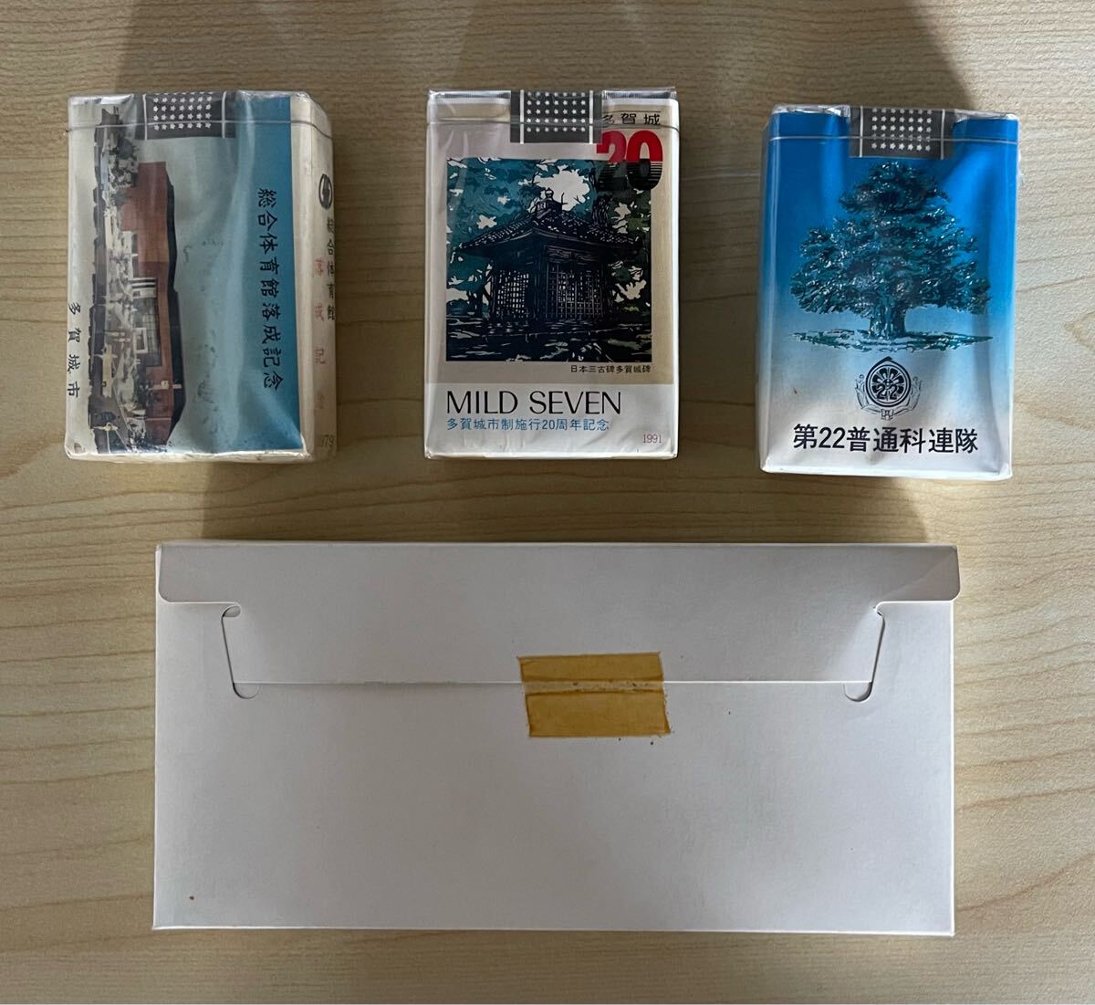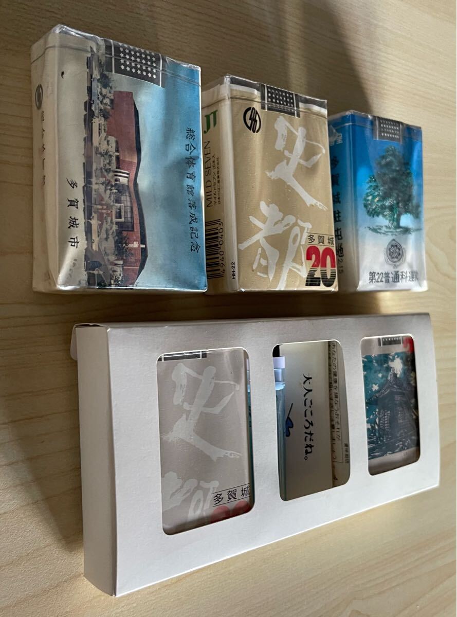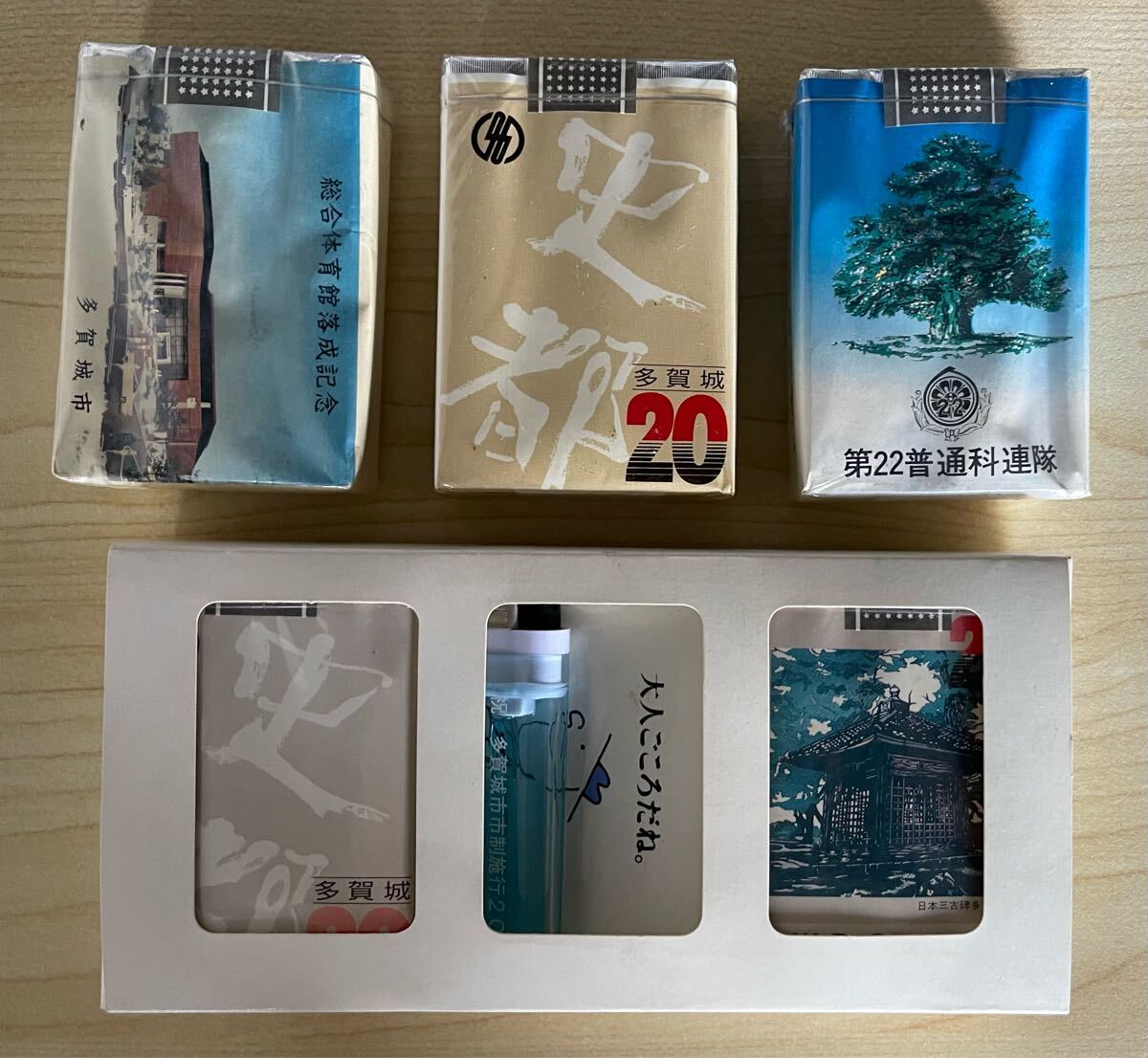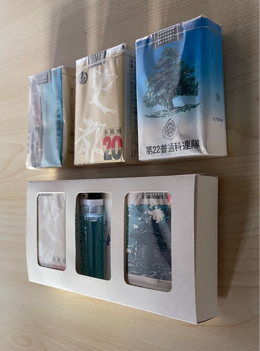 画像上段のタバコパッケージには、「総合体育館落成記念」「多賀城市市制施行20周年記念」「第22普通科連隊」などと記されています。