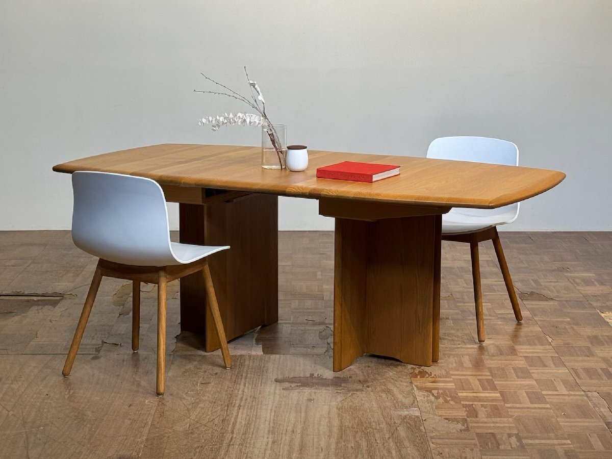 ミッドセンチュリー期らしい最高品質のオーク無垢材を贅沢に用いた重厚な構成に、カットラインの丸みやエッジーな構成を幾重にも組み合わせた手の込んだデザインを掛け合わせた、世界最高峰の工業技術を誇ったドイツらしいインダストリアルデザインのモダニズム性とクラフツマンシップの工芸性を掛け合わせたダイナミックでラグジュアリーな1960sヴィンテージ / 伸長式ダイニングテーブル。ドイツ・Lubke より。
