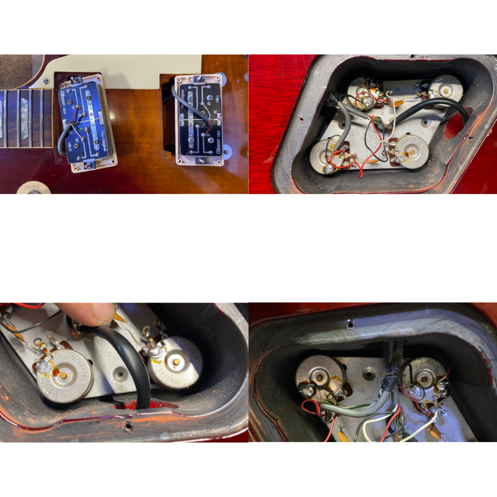 ピックアップは The Original HB-R/HB-L、いわゆる基盤ピックアップです。同年代では刻印ナンバードPAFなど様々なパターンがありますが本機はオリジナルで基盤ピックアップが搭載されていたようです。ポットは全てオリジナルで、確認した範囲では再ハンダの形跡もありません。