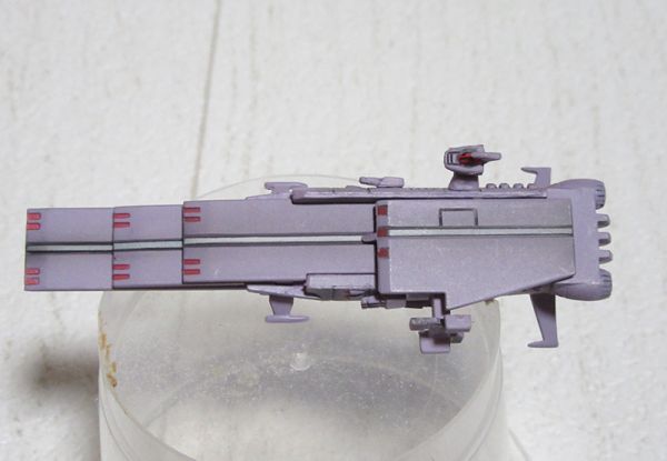 コスモフリートの三段空母は小さいながら出来が良く、左舷のオープンデッキやアングルドデッキ、エレベーターなども再現されてる上に、艦底部のインテークまで設定通りちゃんと再現されてます(写真4枚目を参照)。