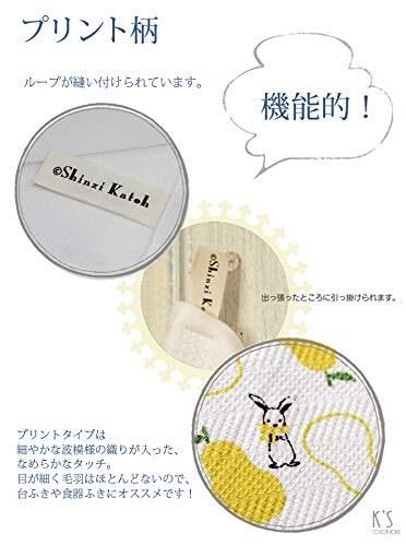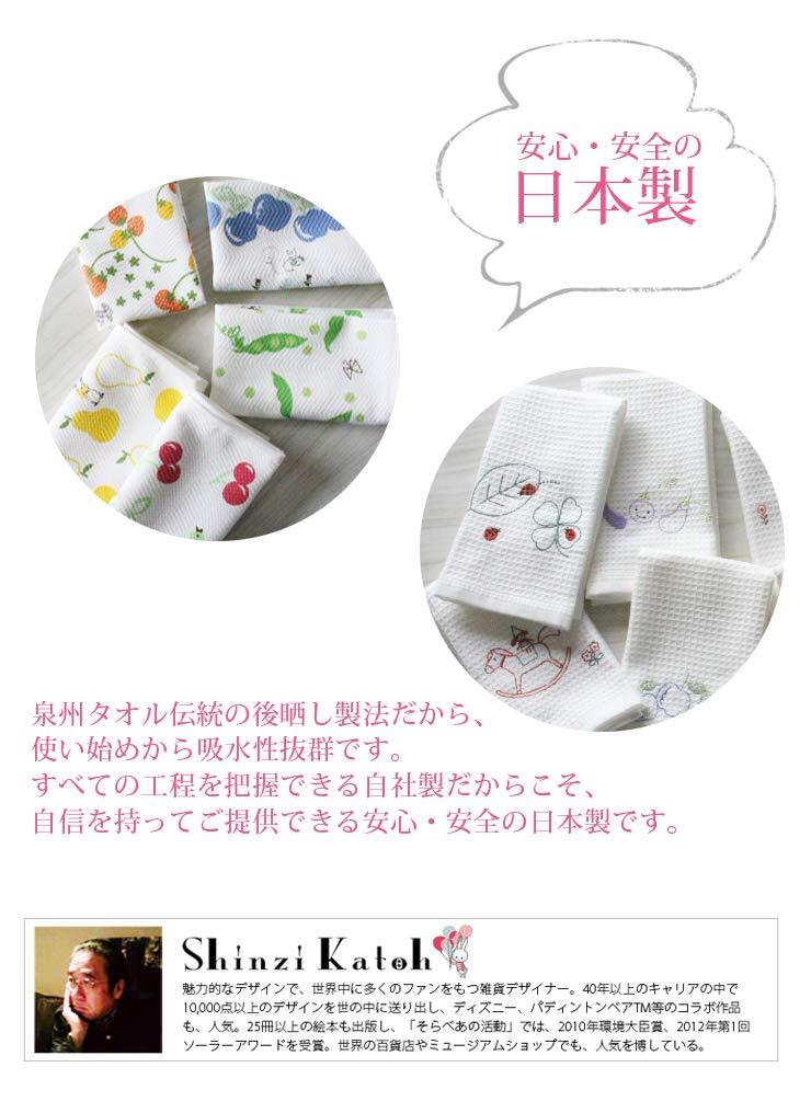 サイズ/約31×25cm [製造国] 日本 パイルがない、波模様織りの日本製キッチンタオルです。 【プレゼントに】抗菌防臭効果のある「クラビオン」を織り込んでいるので、清潔感が持続します。帯付きなので、ちょっとしたプレゼントに、ごあいさつやお返しに。便利なループもついています。 【高品質な泉州タオル】泉州タオル伝統の後ざらし製法だから、使い始めから吸水性抜群です。安心・安全の日本製。 【かわいいプリント柄】可愛いモチーフのプリント柄! 毛羽が付きにくい生地はお子様の口や手ふきにも。 人気雑貨デザイナー“シンジカトウが描くデザインが、高品質なキッチンタオルになりました。 抗菌・防臭効果のある「クラビオン」という繊維を織り込んでいますので、半永久的に清潔感が続きます。 ループ付きで便利、気軽なごあいさつやお返し、プレゼントに喜ばれます。優しい肌触りなので、食器ふきだけでなく、お子さんのお口ふき、お手ふきにもどうぞ。 【ご注意】 ・クラビオン効果を持続させるために『塩素系漂白剤』はご使用しないで下さい。 (酸素系漂白剤は使用可能です。) ・また、臭いの原因となるモラクセラ菌を死滅させるには、『50~60℃のお湯に、20~30分』つけて下さい。)