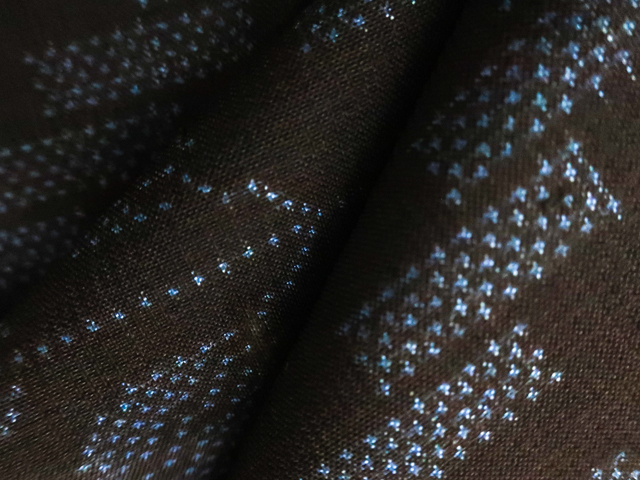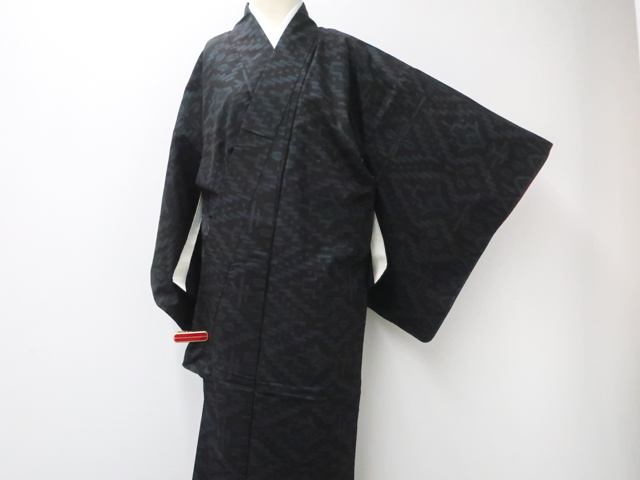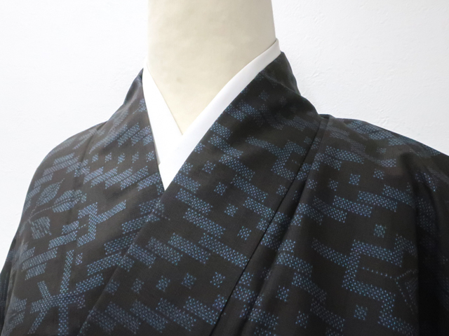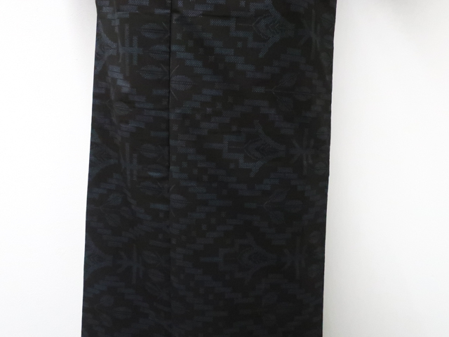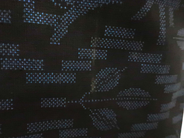 リサイクル商品のため、胴裏にしみがございます。 上前裾に薄汚れがございますが着用可能なお品です。 バチ衿でございます。 地色は青・黒です。 1枚目の画像が近いお色かと思われます。 素材は正絹です。 |