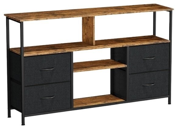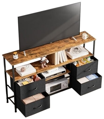 ●幅広の天板、4つの布製引き出し、オープンシェルフ付きで、DVDプレーヤーやゲーム機、雑誌、小物などをすっきり収納 / 中央棚は取り外し可能で、高さのあるスピーカーもラクラク収納可能 / 布引き出しは通気性の良いポリエステル×不織布製で、見た目もスッキリ&機能的 / 初心者でも安心の簡単組立