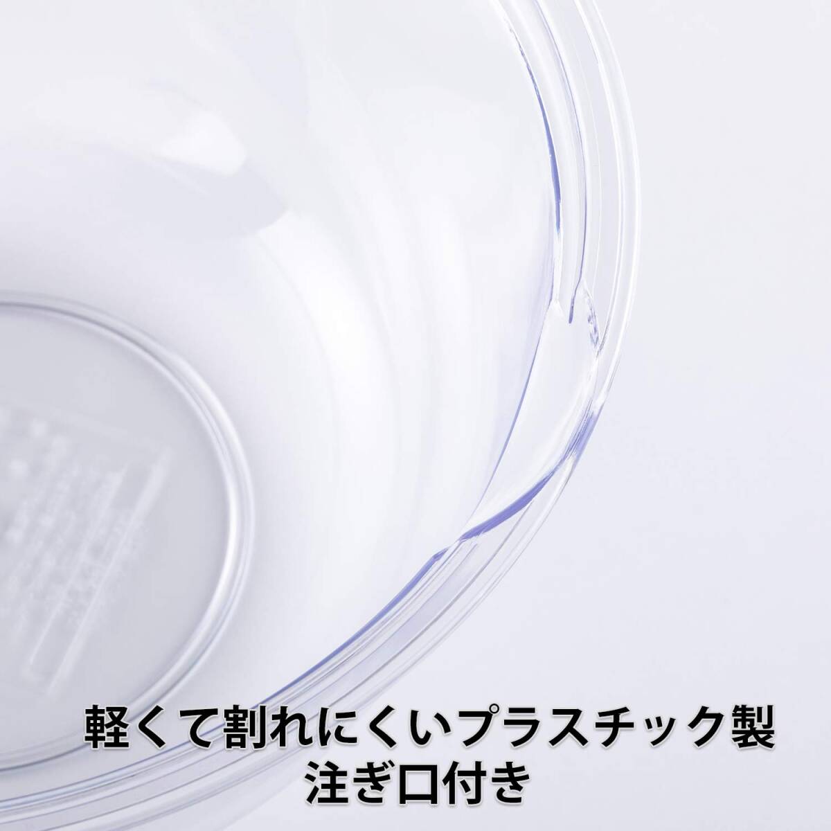 ●お子様でもお手伝いが楽しくなるリトルシェフクラブシリーズ ●中の材料がよく見える透明のボウル ●ガラスと比べて割れにくいプラスチック製なので安心 ●ガラスボウルよりも軽く、子供でも持ちやすい