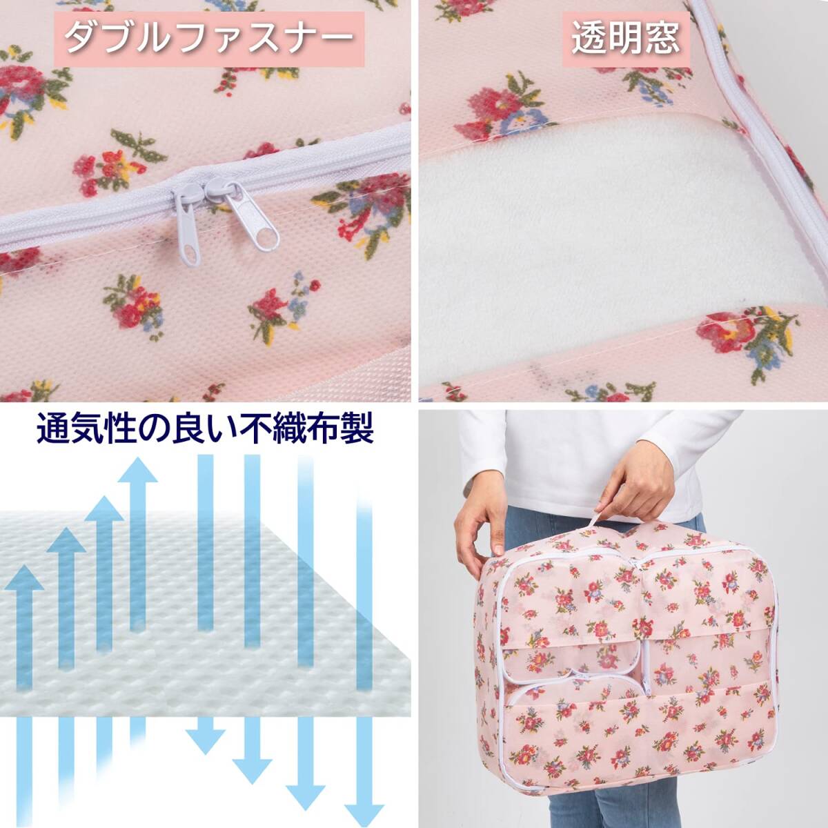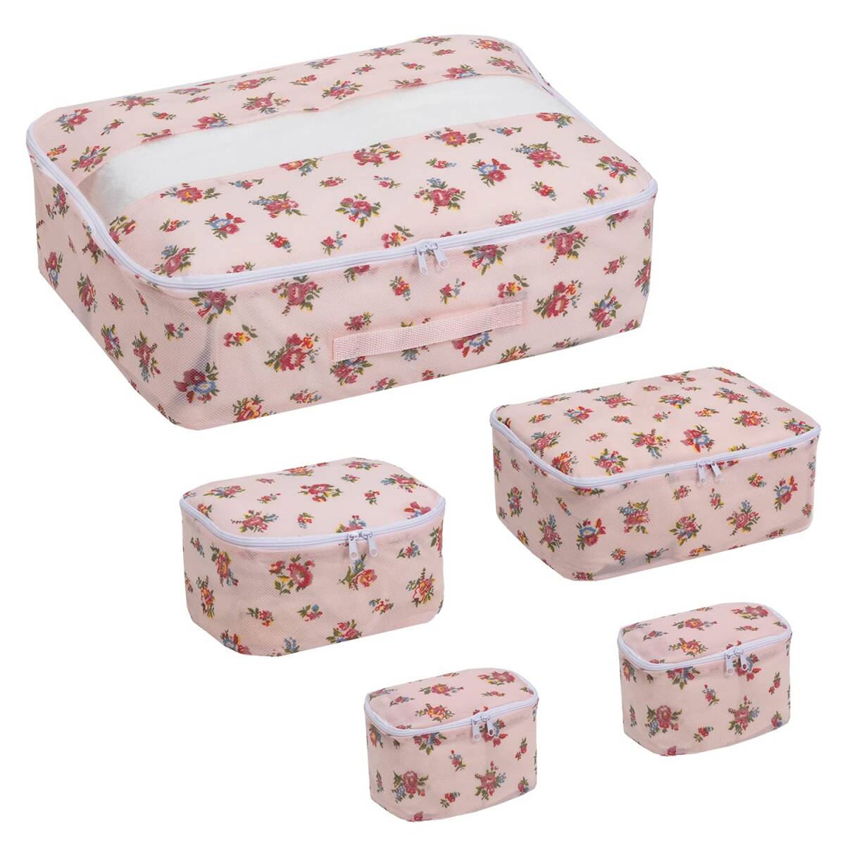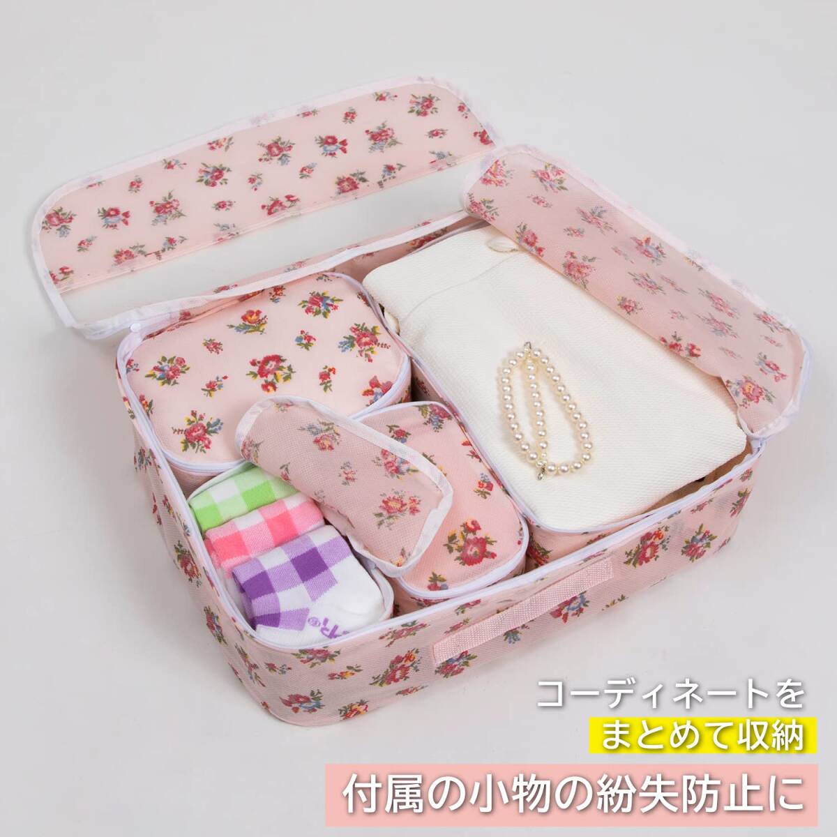 ・【商品仕様】:サイズ/SSサイズ:約幅15×奥行10×高さ10cm・Sサイズ:約幅20×奥行15×高さ10cm・Mサイズ:約幅30×奥行20×高さ10cm・Lサイズ:約幅42×奥行32×高さ12cm(透明窓・持ち手付き)、カラー/薄ピンク、柄/小花柄、内容/5個(SSサイズ2個・Sサイズ1個・Mサイズ1個・Lサイズ1個)、材質/本体:ポリプロピレン・透明窓(Lサイズのみ):ポリエチレン