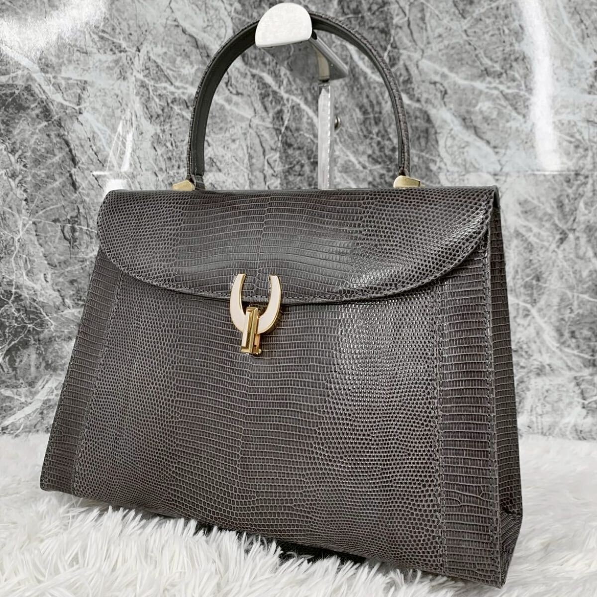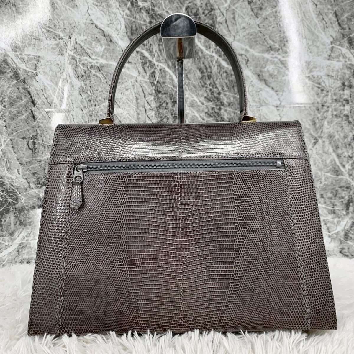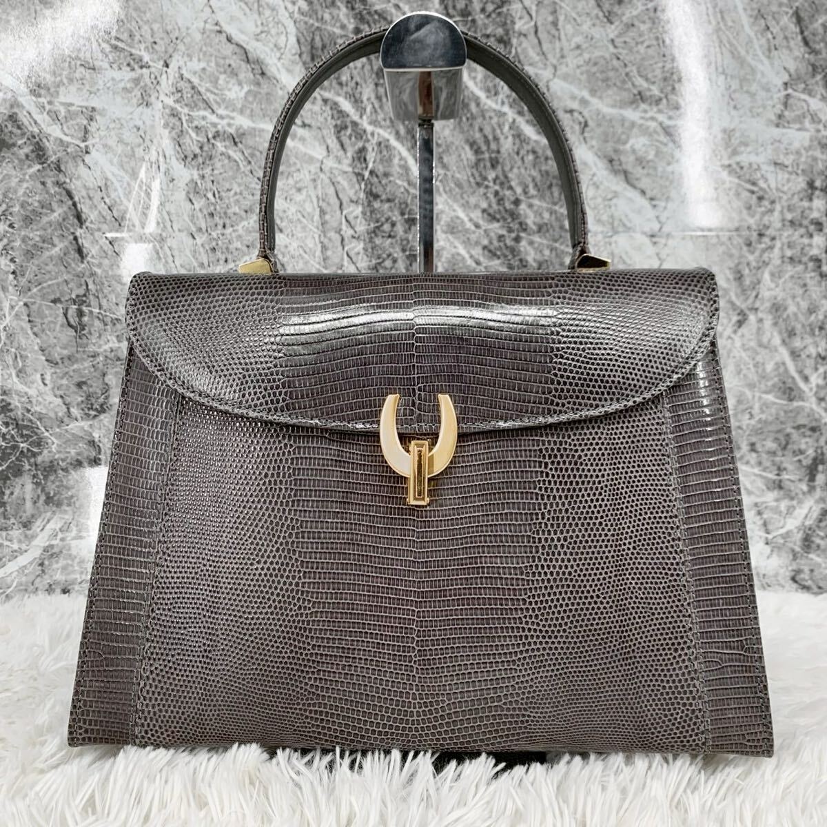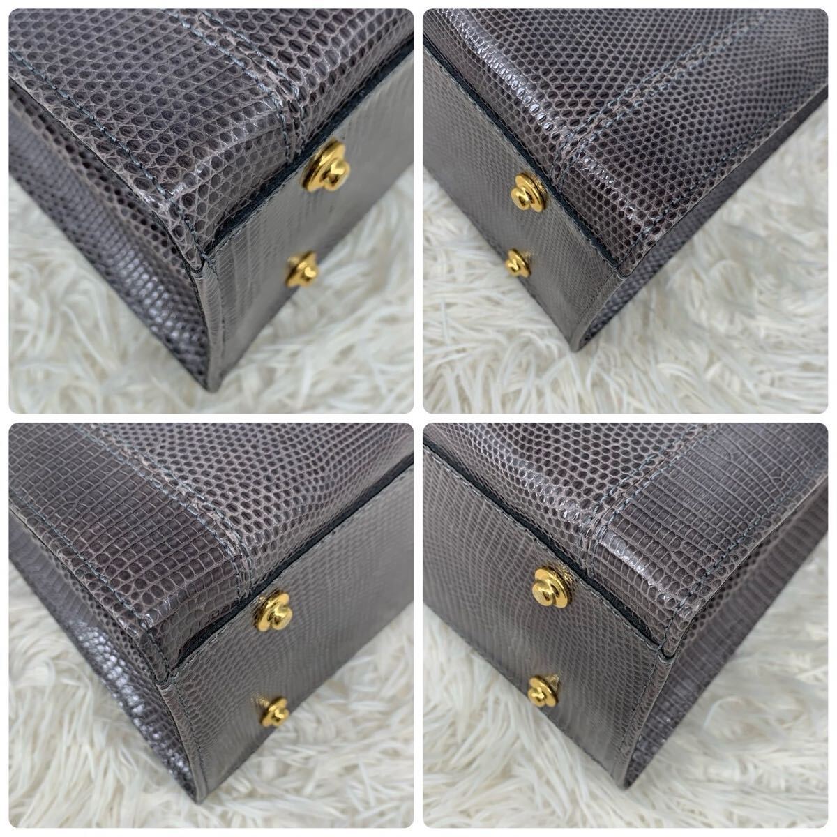 【美品 超希少】リアル リザードレザー ハンドバッグ トップハンドル レア ゴールド金具 エキゾチック センター取り フォーマル グレー