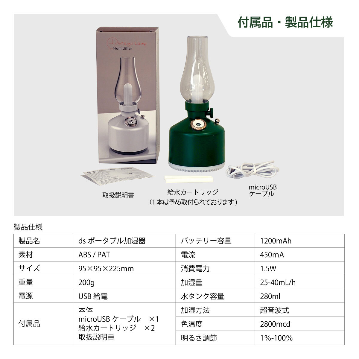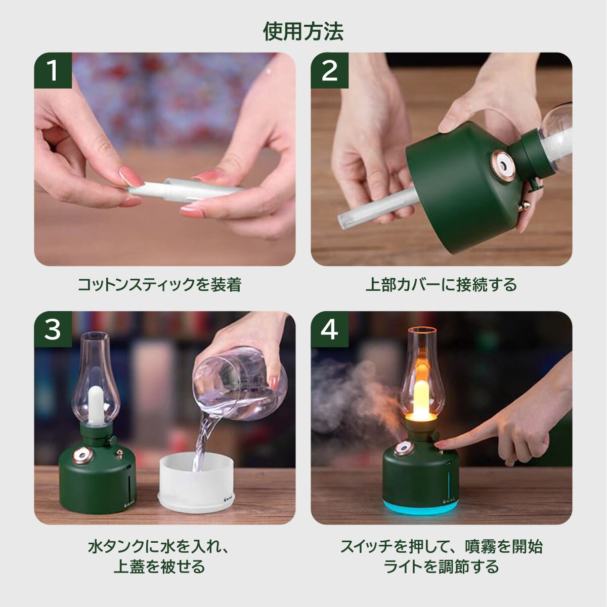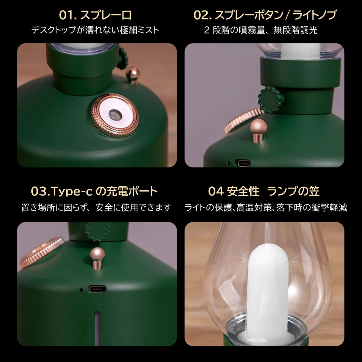 充電式加湿器 USB充電 ヴィンテージランプ アロマディフューザー エッセンシャルオイル コードレス LEDランプ 小型 グリーン 出荷締切18時
