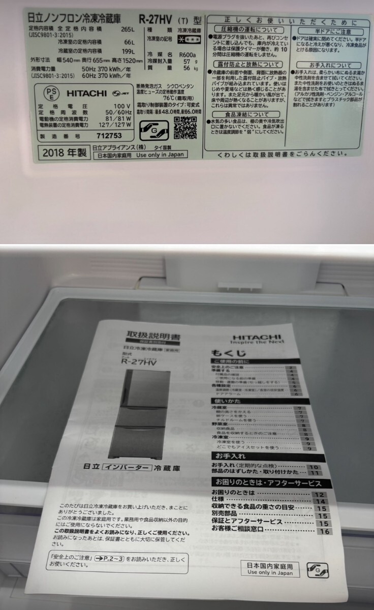 741☆【引き取り限定】 日立 ノンフロン冷凍冷蔵庫/R-27HV/265L/2018年/中古/ 3ドア