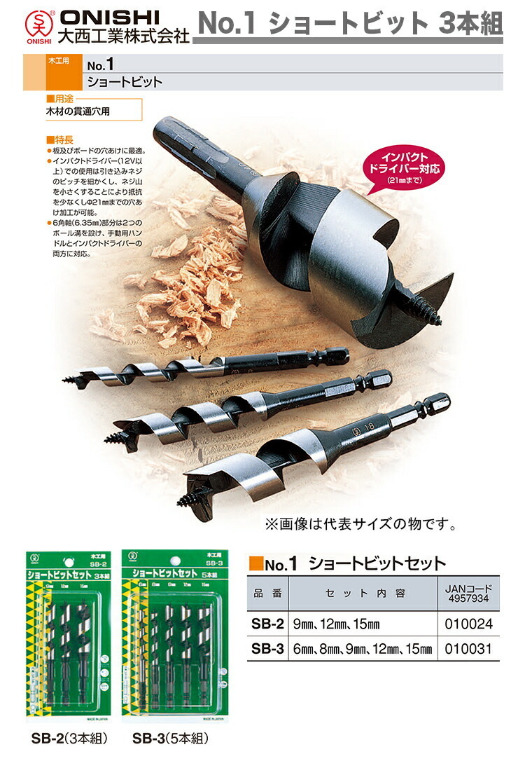 ONISH/大西工業 No.1 ショートビット 5本組 SB-3 6/8/9/12/15mm