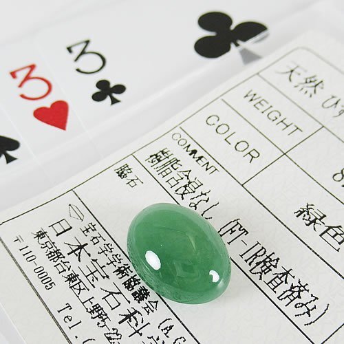 | 品名 /【SJ】新品 ヒスイ(ジェイダイト) 8.12ct ジュエリールース 材質 / 天然ヒスイ(ジェイダイト) 縦・横 / (約)14mm 10.5mm 厚さ / (約)6.2mm 総重量 / 8.12ct 日宝協ソーティング付き 【SJ】/ 新品製品 品番 / ACD649 参考小売価格 / 310,000円 |