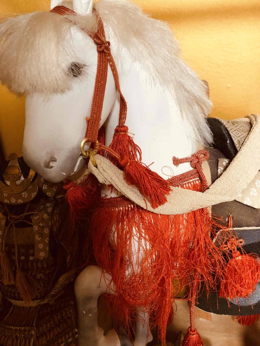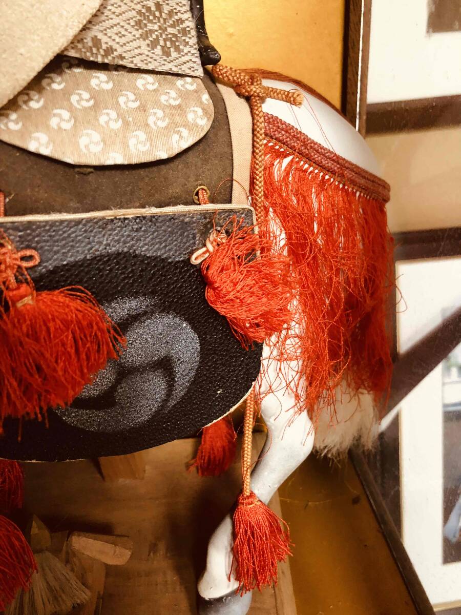 状態: 古いものですので、馬の飾りや鎧に経年によるホコリ、色あせ、シミ、金属のくすみが見られます。ガラスケースにも傷や汚れがあります。