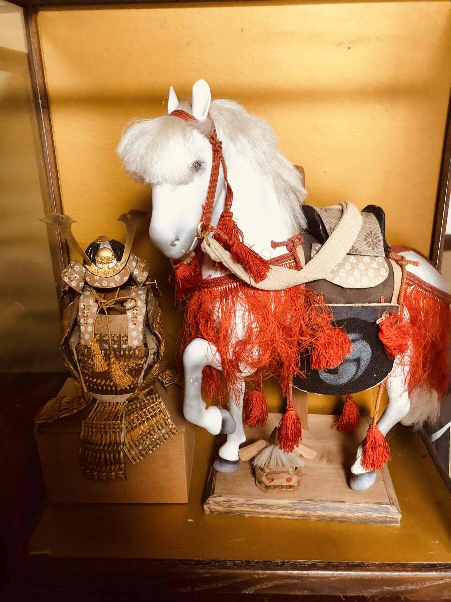 実家の整理にて出てきた五月人形の馬飾りと鎧がセットになったガラスケース飾りです。
