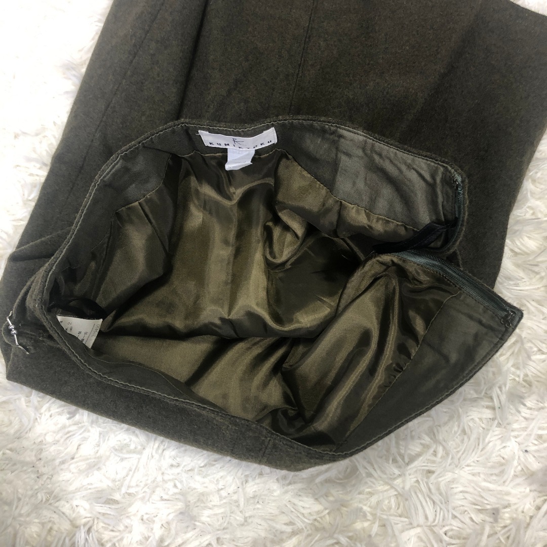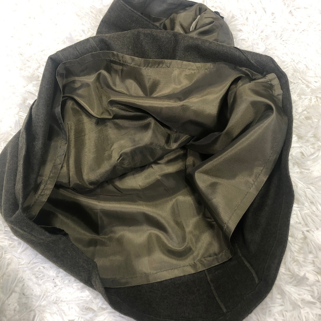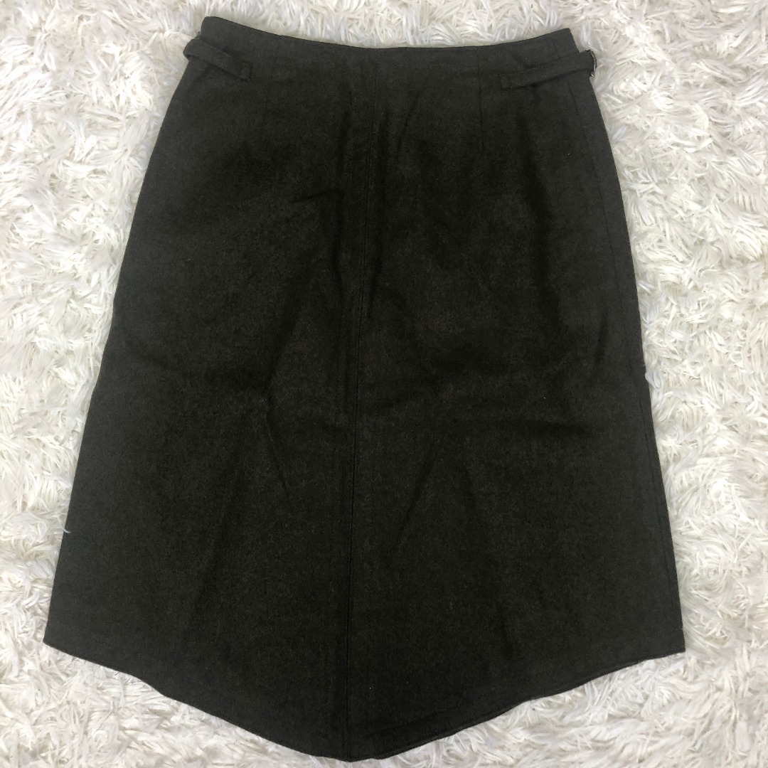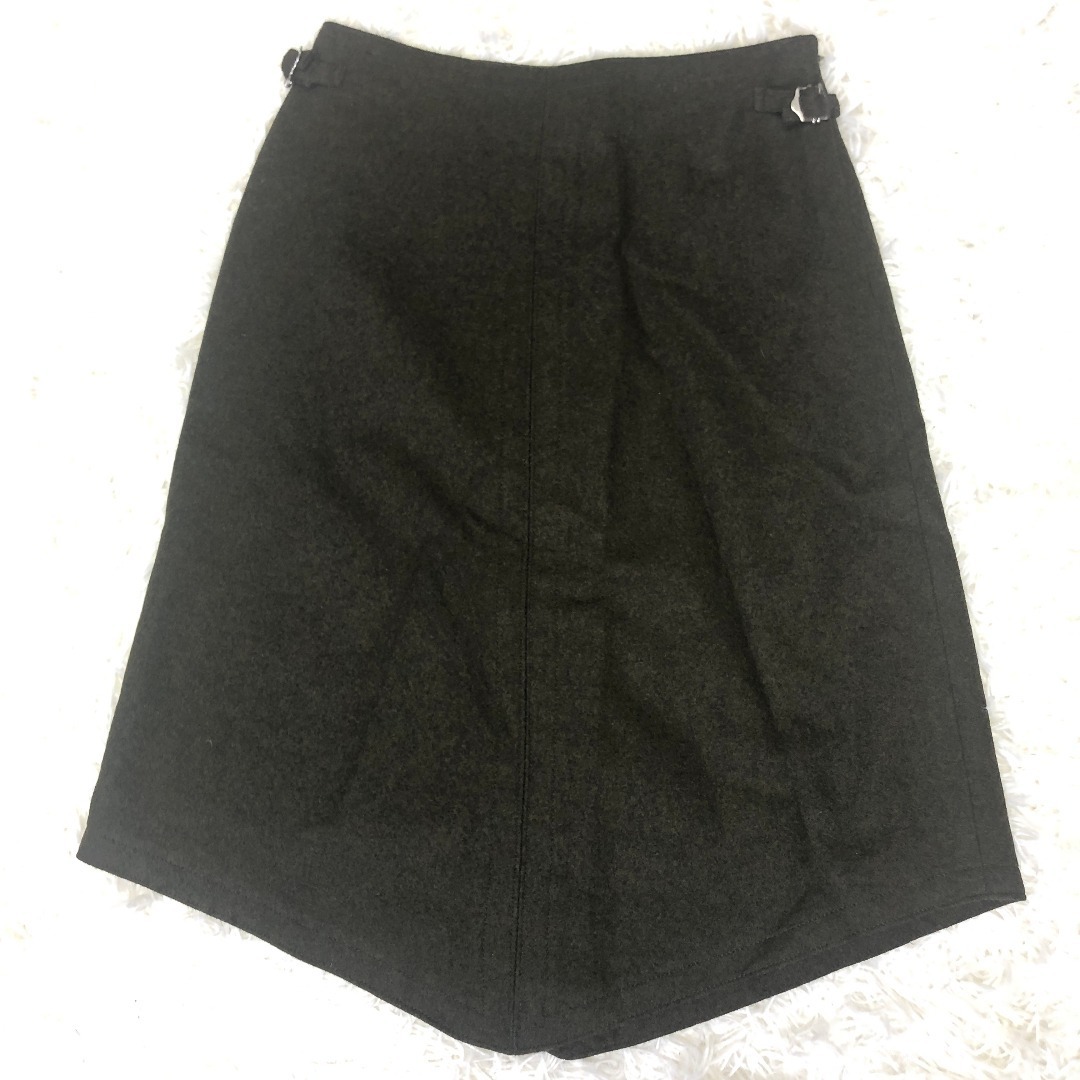 真ん中の丈が一番長いです!アシンメトリーな裾のデザインが特徴的なウール混・台形スカートです。ウエスト部分にはベルトのようなバックルデザインがあり、トップスをインして着ても素敵です。裏地付き。左側ファスナー+ホックにて着脱します。