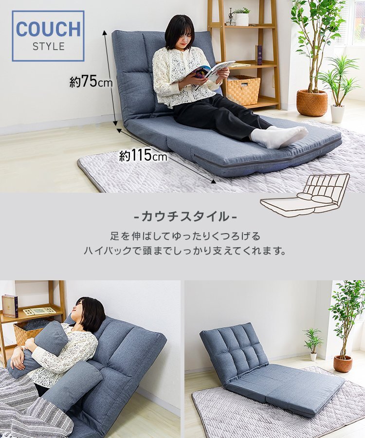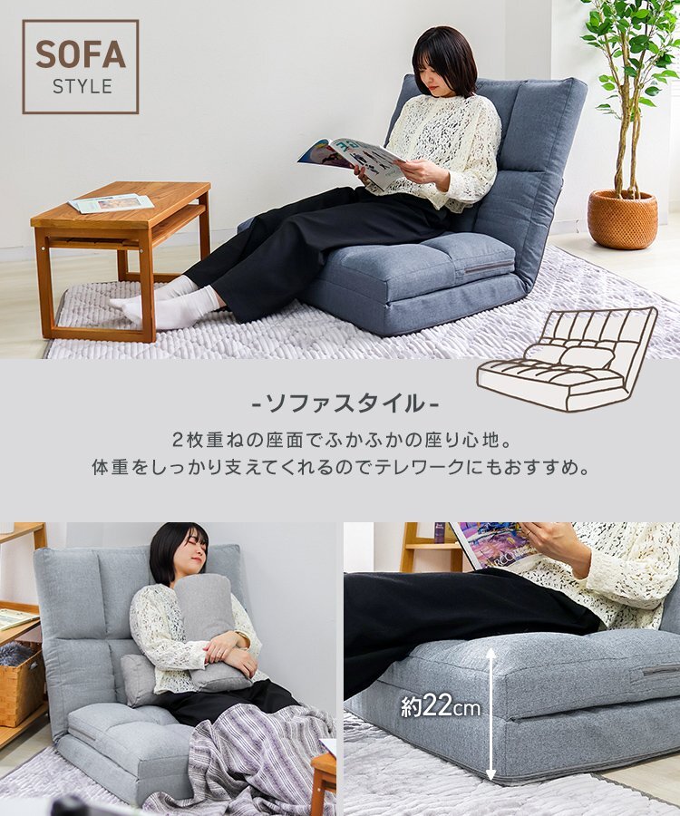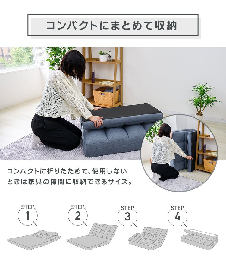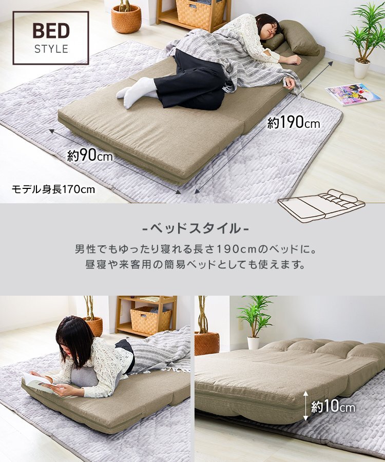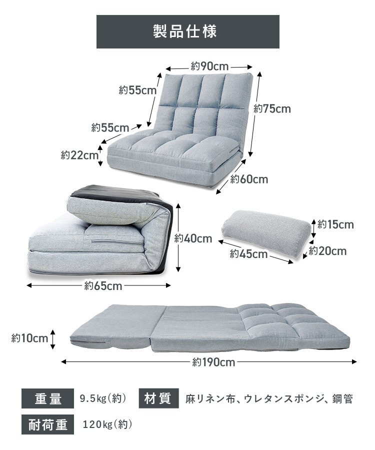 ソファ、カウチ、ベッドの3wayで使えるソファベッドです。 枕や腰掛けに使えるクッション2個付き♪ 座面幅はゆったり座れる約90cm! コンパクトながら男性でもくつろげるサイズ感です。 背もたれは14段階のリクライニング仕様! シーンや用途に合わせて細かい角度調整が可能です。 大事な内部リクライニングギアは、日本メーカー「KoYo」の日本製! 折りたたみ可能で、コンパクトに収納ができます。 通気性の良いファブリック素材なので1年中お使いいただけます! \おすすめスタイル/ ・ソファスタイル 座面は2枚重ねでふかふかの座り心地 ・カウチスタイル 足を伸ばしてゆったりくつろげます。 ハイバック仕様で、頭までしっかりと支えてくれます。 ・ベッドスタイル 背もたれと座面を伸ばせば全長約190cmのベッドになります。 【商品仕様】 カラー:ベージュ サイズ:詳細画像参照 重量:(約)9.5kg 耐荷重:(約)120kg 素材:麻リネン布、ウレタンスポンジ、鋼管 【注意事項】 ・ソファベッド本体のカバーは取り外し、洗濯はできません。 (クッション付き 折りたたみ式 1人用 一人用 一人掛け ワイド シングル 1人暮らし 新生活 人気 おすすめ WEIMALL) |