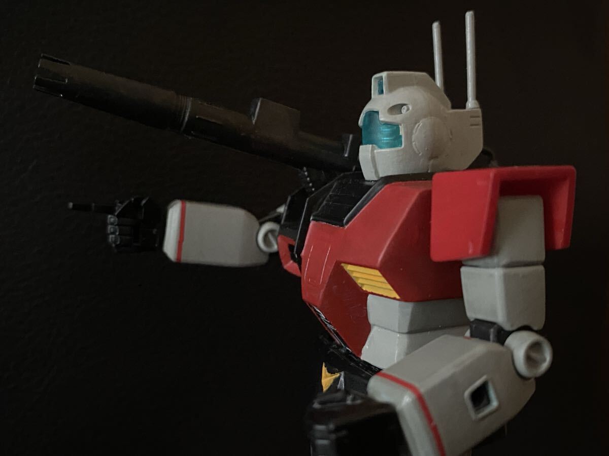 HGUCジムと旧キットジムキャノンのミキシングです。手首は両手拳、スプレーガン握り手、別キットからの指差し右手があります。パッケージ絵の再現をイメージしました。平手、サーベル、弾倉一つは付きません。ご注意ください。