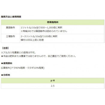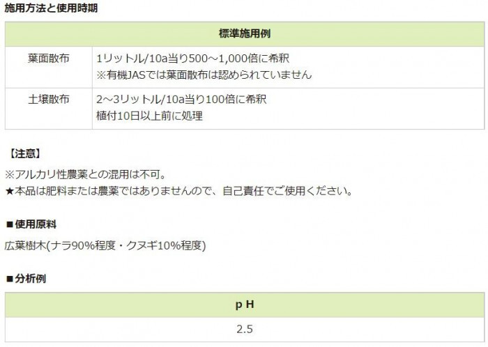 | 宮城県津山町木炭生産組合で生産した精製液は良品で、地元道の駅で評判を呼んでいます。炭材は、ナラ材が90%クヌギが10%程度で、全て自然林の原材料を使用している黒炭です。商品情報で示す通り、生産データ等は森林組合で厳しく管理されており、安心して使用できる製品です。 |