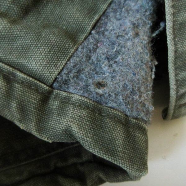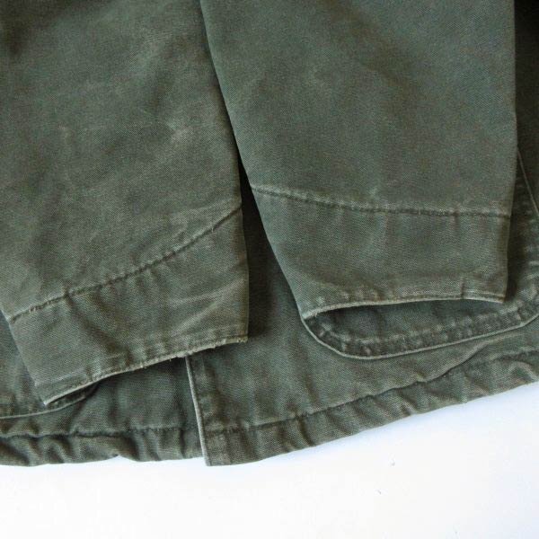 左胸のブランドタグが欠損。リベットに青錆。袖先裾に擦れ、フロント裾上の内側ブランケットに一部小穴があります。