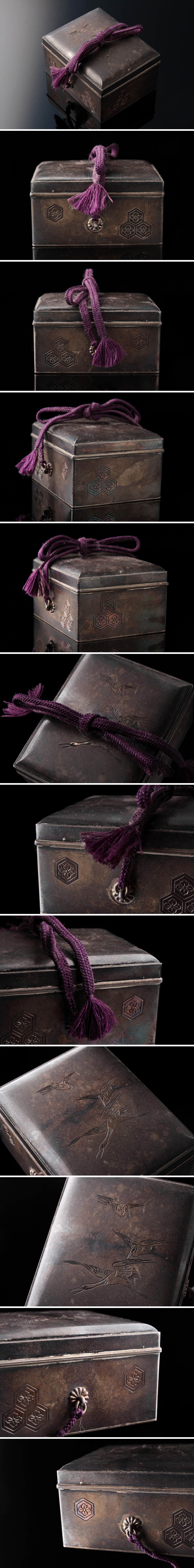 | ◆ 時代物【服部製】純銀 亀甲花菱 三羽鶴文 文箱形ボンボニエール 縦5.5cm 重93g 純銀刻 ◆