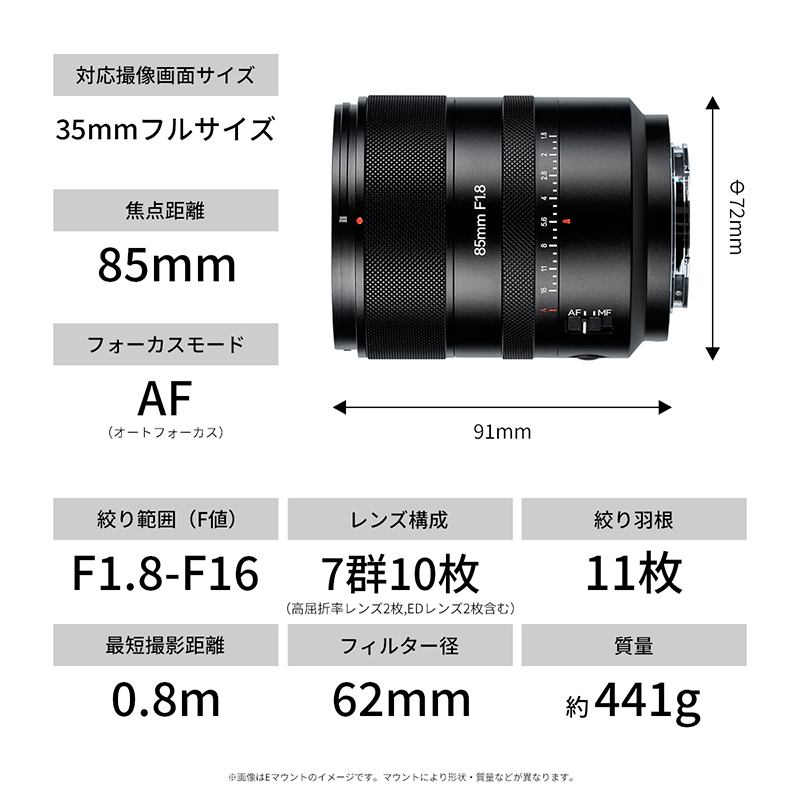 F1.8の大口径による美しいボケ味 明るい開放値がもたらす柔らかく自然なボケが被写体を際立たせ、ポートレート撮影やスナップで立体感のある表現が可能。 EDレンズ+高屈折率レンズによる高画質設計 7群10枚の光学構成が、周辺までクリアで高コントラストな描写を実現。逆光や明暗差の大きなシーンでも色にじみを抑制します。 快適で正確なAF動作 STM(ステッピングモーター)を採用し、高速かつ静音なフォーカス駆動を実現。瞳AFや顔検出にも対応し、撮りたい瞬間を逃しません。 優れた操作性 鏡筒側にAF/MFスイッチとFnボタンを備え、状況に応じて素早く操作可能。クリックレスの無段階絞りリングにより、動画撮影時も音やブレを抑えて滑らかに調整できます。 高品位な外観と扱いやすい重量バランス メタル調の鏡筒は質感と剛性に優れながら、約441gの軽量設計。長時間の撮影でも取り回しやすく、携帯性にも優れています。 仕様