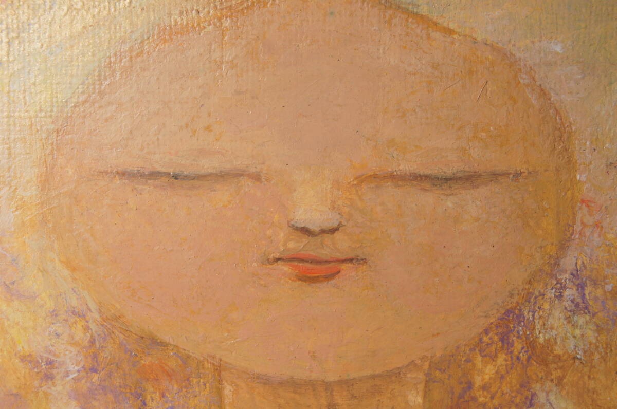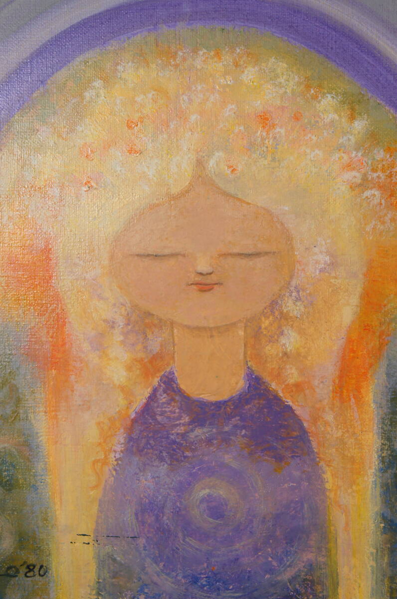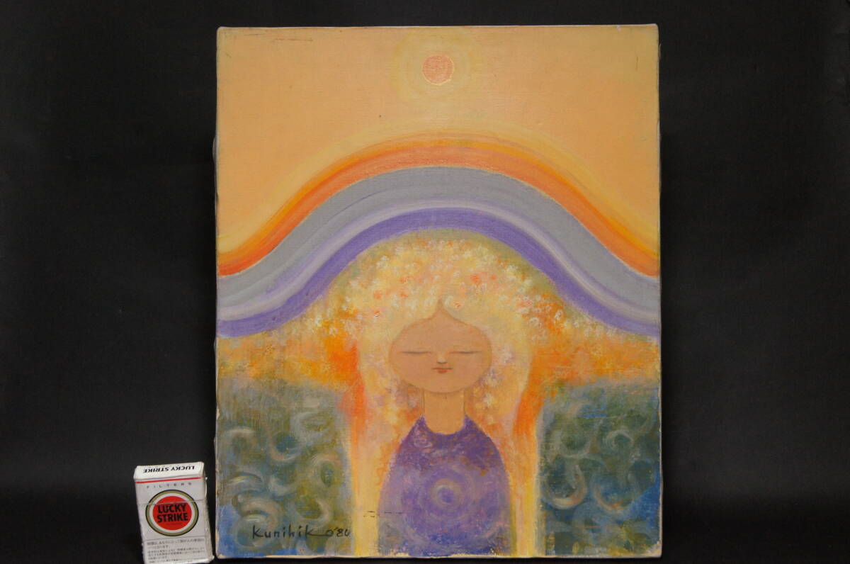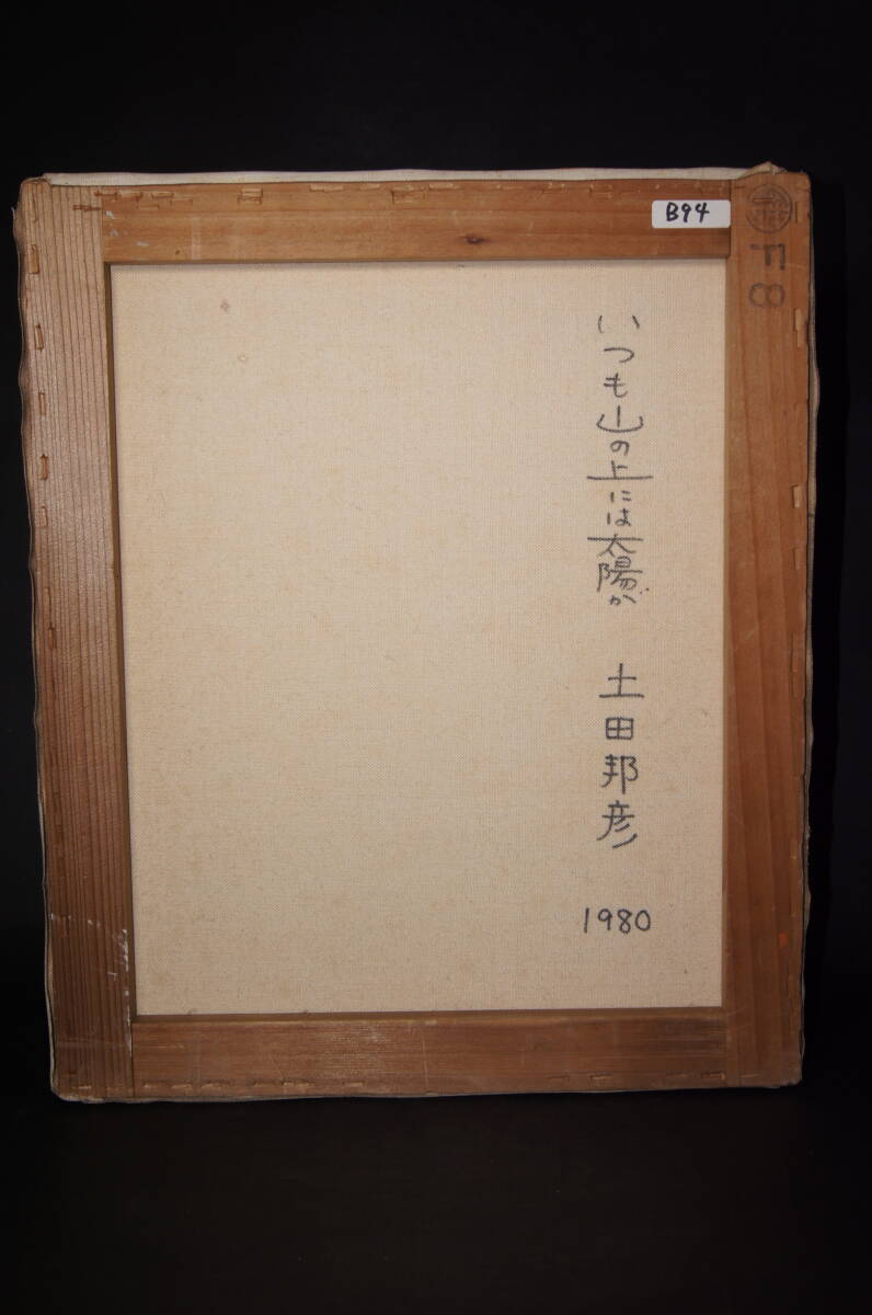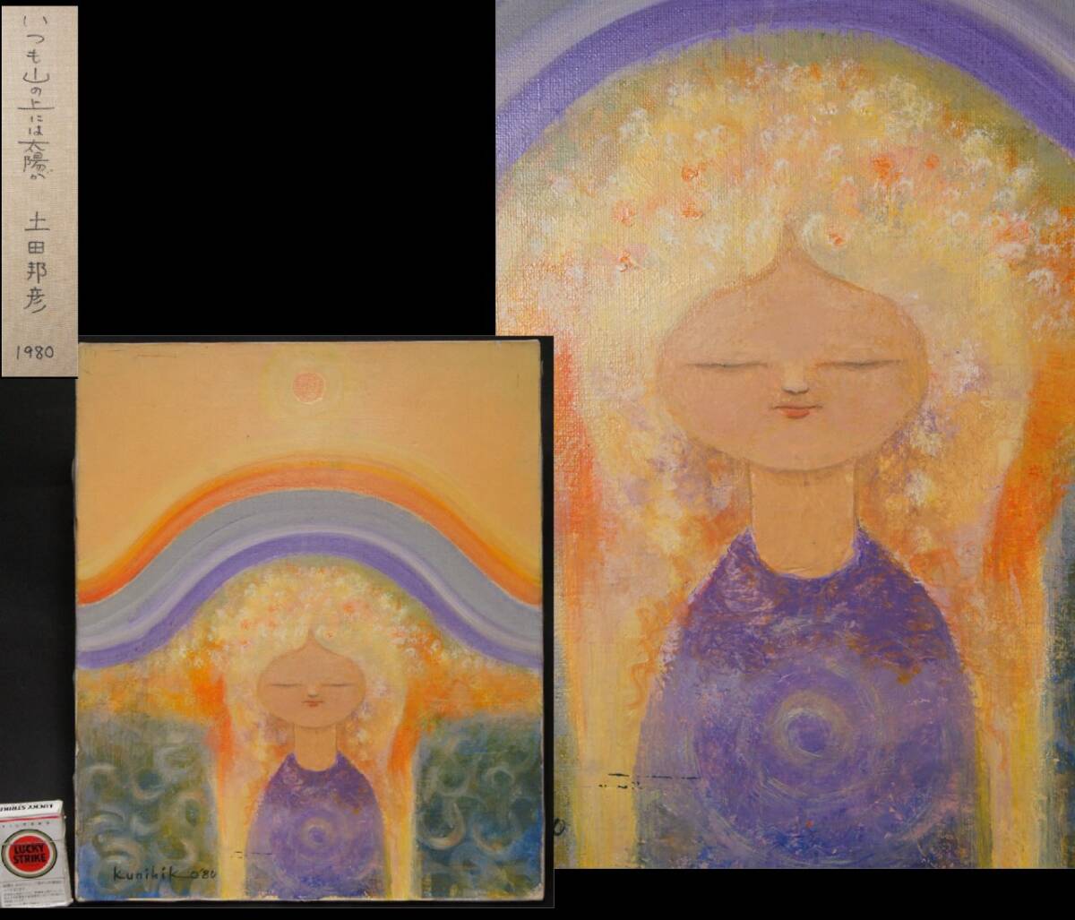 真贋保証 土田邦彦 油彩『 いつも山の上には太陽が 1980 』F8号 サイン有 新潟県長岡市生 あたたかい 太陽 お日様 女性 婦人画 油絵 | |||