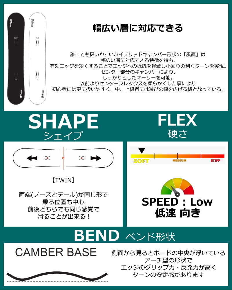 誰にでも扱いやすいハイブリッドキャンバー形状の「風眞」は幅広い層に対応できる特徴を持ち、有効エッジを短くすることでエッジへの抵抗を軽減し小回りの利くターンを実現。センター部分のキャンバーにより、しっかりとしたオーリーを可能。以前よりセンターフレックスを柔らかくした事により初心者には更に扱いやすく、中、上級者には遊びの幅を広げる板となっている。