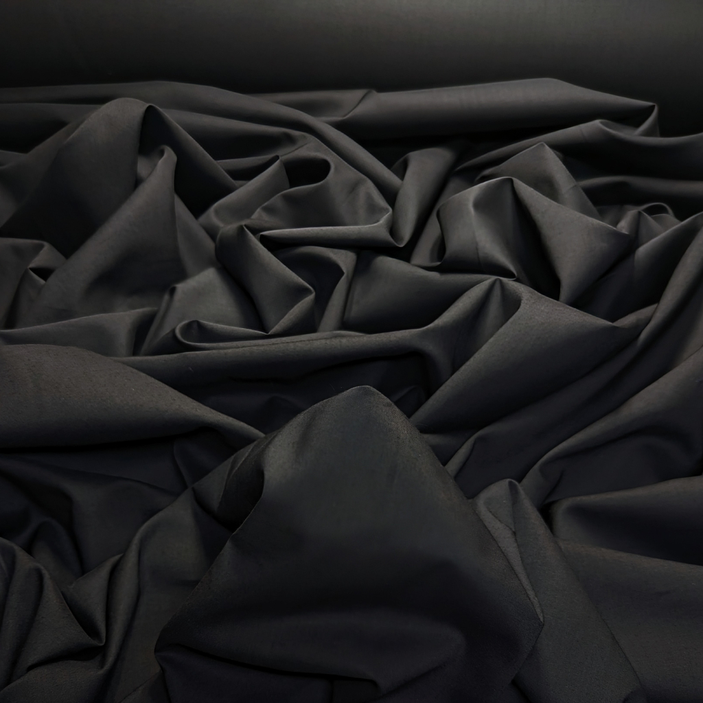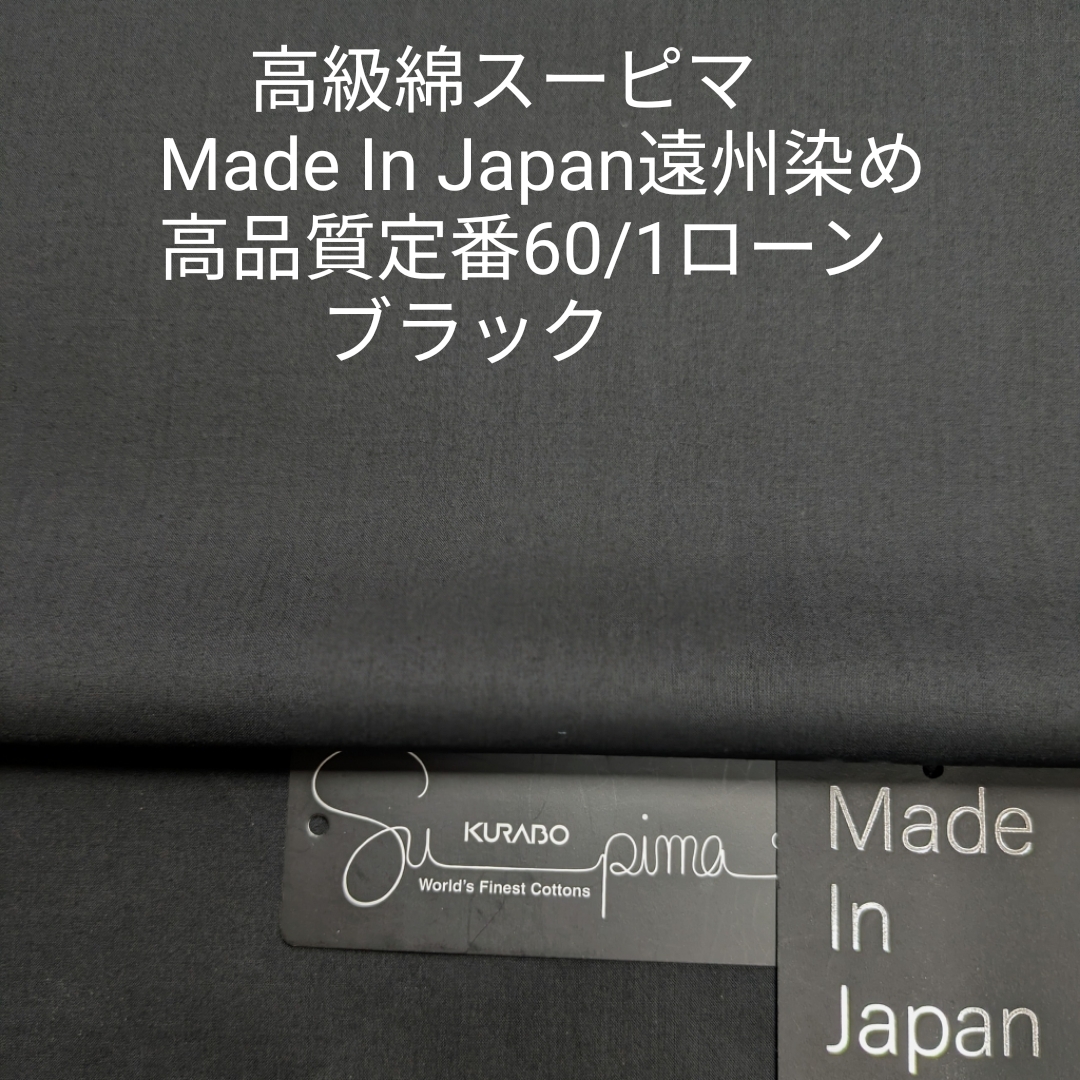 スーピマ綿は美しい光沢感があり、糸フシがなく、しなやかな風合いが特徴の糸です. 超長綿スーピマ綿の光沢感ある糸で織り上げた、定番人気素材の60/1綿ローンを国内は浜松の遠州地区の大手染工所で染め上げた高品質な生地です。 超長綿のしなやかな落ち感と高級感すら感じられるほのかな光沢感ある綿ローンです。 高級綿で色の発色が良く人気定番ブラックになります。 シーズンレスでホームソーイングの定番素材です。 サイズ 112cm×2m 綿100%