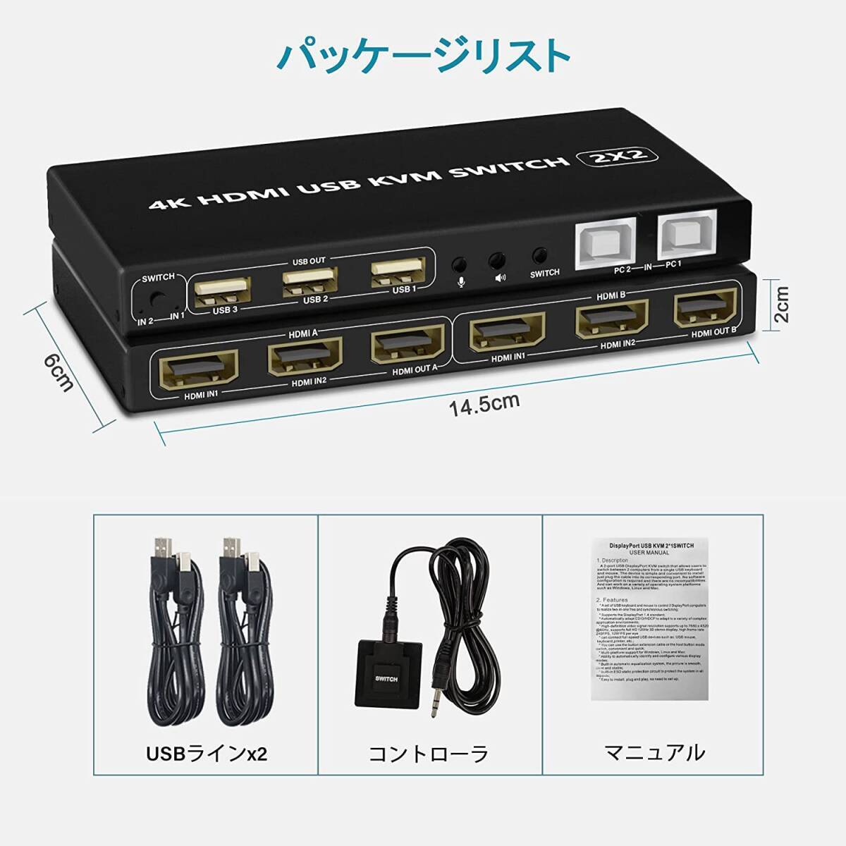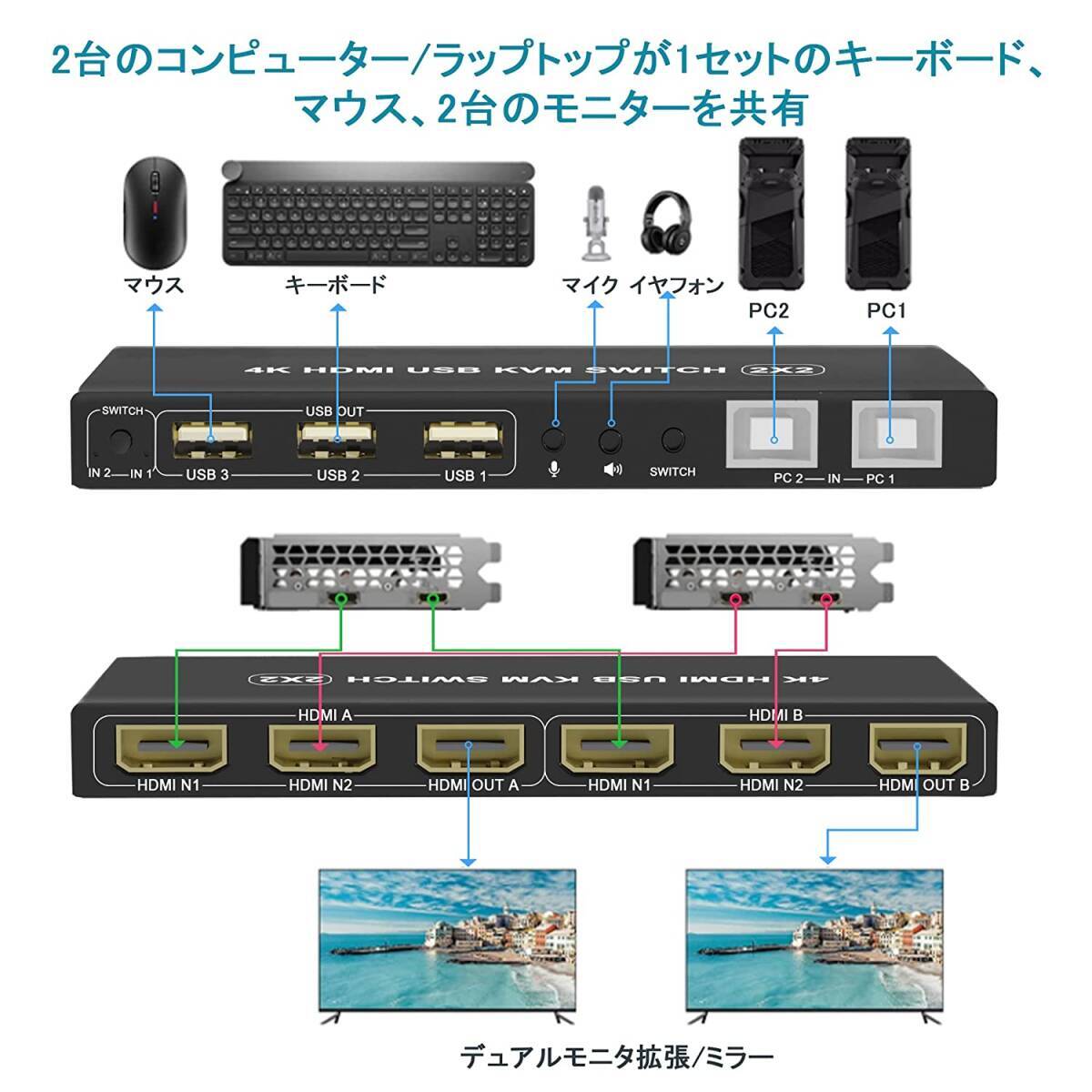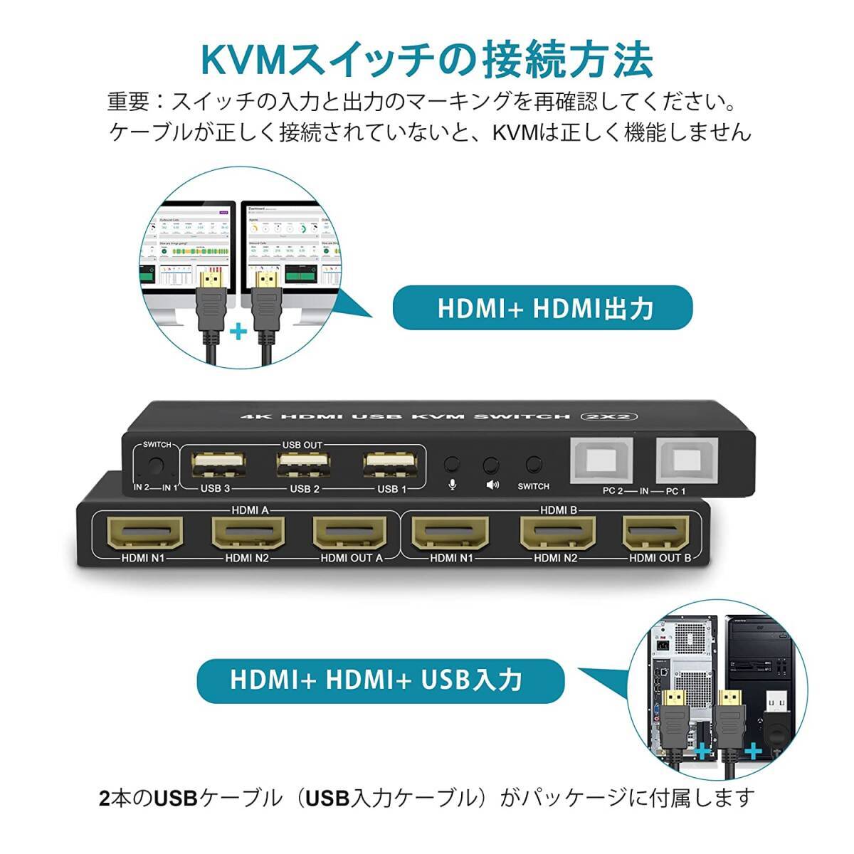 【デュアルモニターHDMI KVMスイッチ2ポート】コンソールは、USBキーボード、マウス、モニターの1つの独立したセット、またはデュアルヘッド入力を備えた拡張または複製ディスプレイ2台で、最大2台のコンピューターまたはラップトップを制御します。作業スペースを整頓して効率的にするための最良のKVMスイッチであり、自宅で作業するためのプレミアムな選択肢でもあります。【2ポートKVMスイッチHDMIデュアルモニター】最大2台のコンピューターまたはラップトップを1セットのUSBキーボード、マウスで制御し、拡張またはコピー表示用のデュアルモニターを共有します。すべてのコンピュータが2画面以上の表示機能をサポートしている必要があります。コンピューターがこの機能をサポートし、HDMIインターフェイスが1つしかない場合は、コンバーターまたは変換ケーブル(VGA / DVI / DPからHDMIへのコンバーターまたは変換ケーブルなど)を使用できます。【4K @ 60Hz HDMI KVMサポートオーディオマイク】最大4K @ 60Hzの高解像度画像をお楽しみください。オーディオとマイクの出力は、個別にサポートされています。頑丈さを確保するための重量のあるハイエンドの干渉防止金属設計。今すぐ購入して違いを確認してください!【2つの切り替え方法と幅広い互換性】1。フロントパネルの選択を切り替えます。 2.有線リモートスイッチ(ワンタッチスイッチ)。複数のオペレーティングシステムとデバイスのクロスサポート:Windows 10/7/2000 / XP /およびMacと完全に互換性があります。 Webカメラ、ハードディスクプレーヤー、ゲーム機、DVR、NVRなどのHDMIデバイスもサポートします。【USB2.0ハブ付きドライバーフリーKVM HDMIスイッチ】プラグアンドプレイ:ドライバー不要:すべてのケーブルとDC 5V電源アダプター、USBプリンター、スキャナー、ジャンプドライブ、ワイヤレスおよびゲーミングキーボードマウスを共有するための追加のUSB2.0ポートが含まれます。