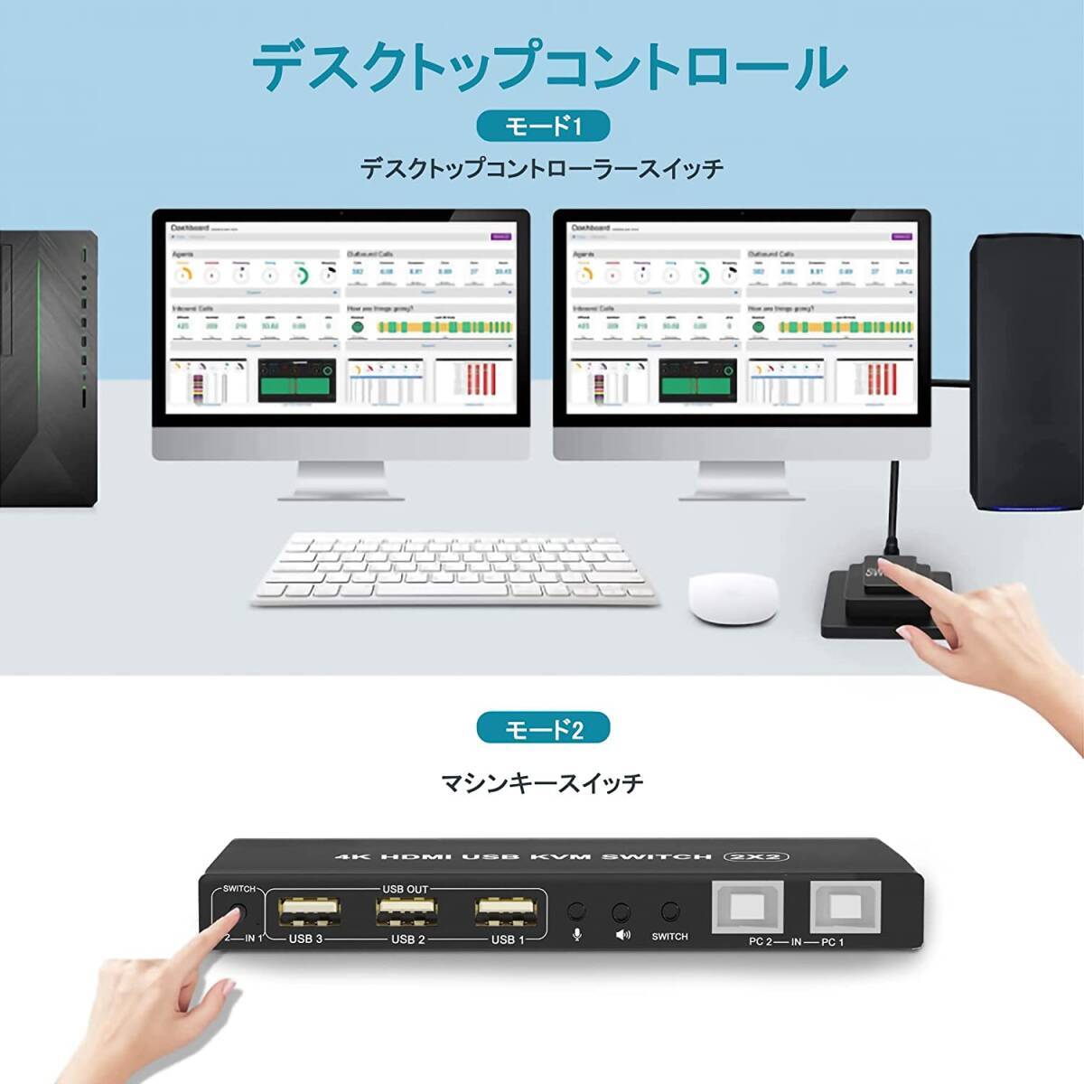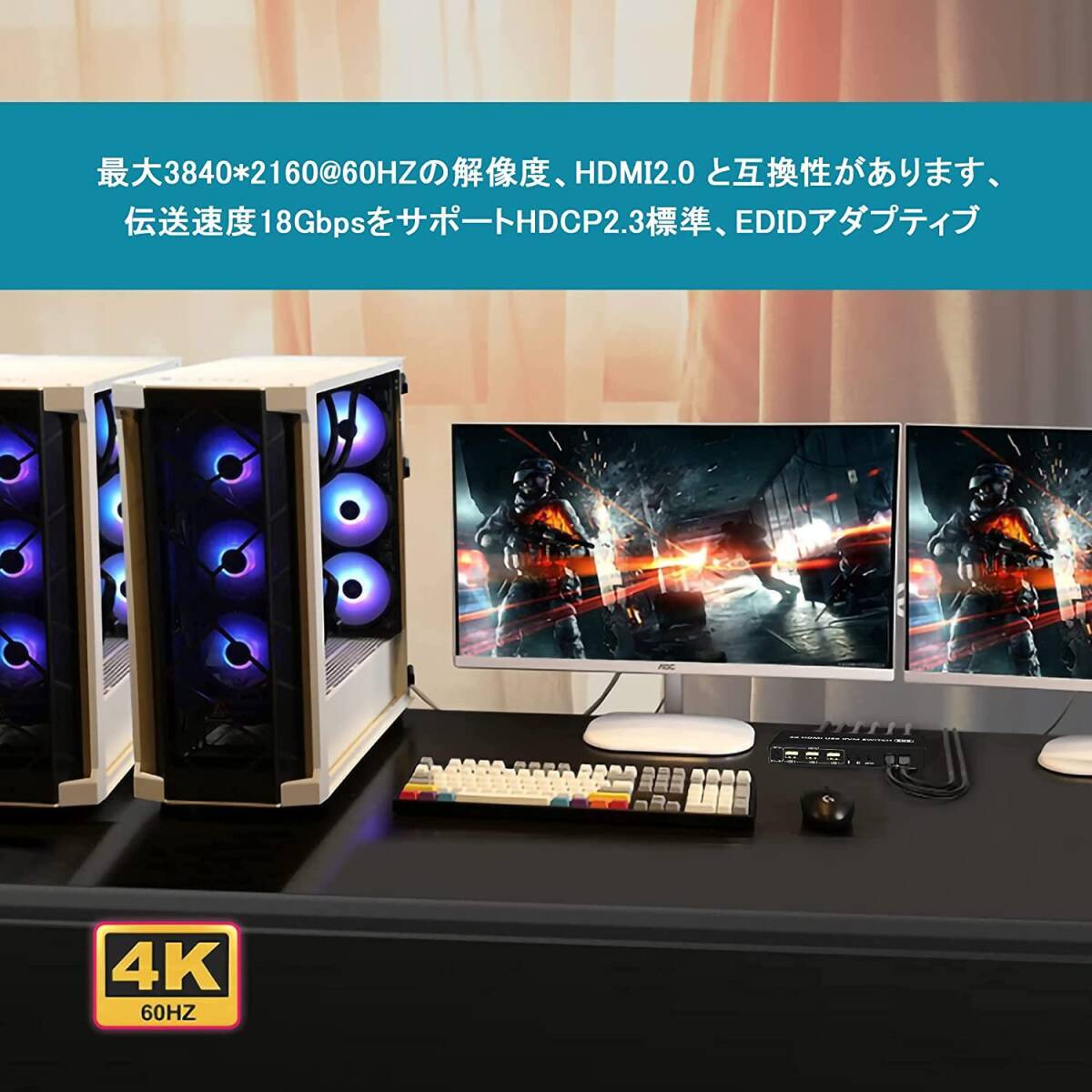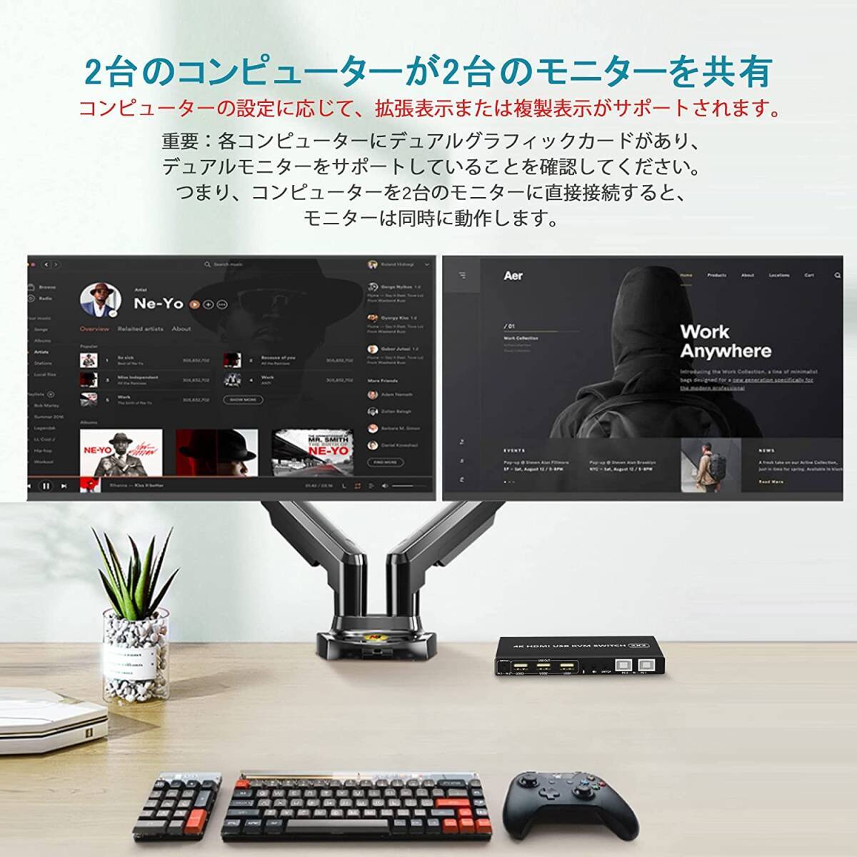 【デュアルモニターHDMI KVMスイッチ2ポート】コンソールは、USBキーボード、マウス、モニターの1つの独立したセット、またはデュアルヘッド入力を備えた拡張または複製ディスプレイ2台で、最大2台のコンピューターまたはラップトップを制御します。作業スペースを整頓して効率的にするための最良のKVMスイッチであり、自宅で作業するためのプレミアムな選択肢でもあります。【2ポートKVMスイッチHDMIデュアルモニター】最大2台のコンピューターまたはラップトップを1セットのUSBキーボード、マウスで制御し、拡張またはコピー表示用のデュアルモニターを共有します。すべてのコンピュータが2画面以上の表示機能をサポートしている必要があります。コンピューターがこの機能をサポートし、HDMIインターフェイスが1つしかない場合は、コンバーターまたは変換ケーブル(VGA / DVI / DPからHDMIへのコンバーターまたは変換ケーブルなど)を使用できます。【4K @ 60Hz HDMI KVMサポートオーディオマイク】最大4K @ 60Hzの高解像度画像をお楽しみください。オーディオとマイクの出力は、個別にサポートされています。頑丈さを確保するための重量のあるハイエンドの干渉防止金属設計。今すぐ購入して違いを確認してください!【2つの切り替え方法と幅広い互換性】1。フロントパネルの選択を切り替えます。 2.有線リモートスイッチ(ワンタッチスイッチ)。複数のオペレーティングシステムとデバイスのクロスサポート:Windows 10/7/2000 / XP /およびMacと完全に互換性があります。 Webカメラ、ハードディスクプレーヤー、ゲーム機、DVR、NVRなどのHDMIデバイスもサポートします。【USB2.0ハブ付きドライバーフリーKVM HDMIスイッチ】プラグアンドプレイ:ドライバー不要:すべてのケーブルとDC 5V電源アダプター、USBプリンター、スキャナー、ジャンプドライブ、ワイヤレスおよびゲーミングキーボードマウスを共有するための追加のUSB2.0ポートが含まれます。