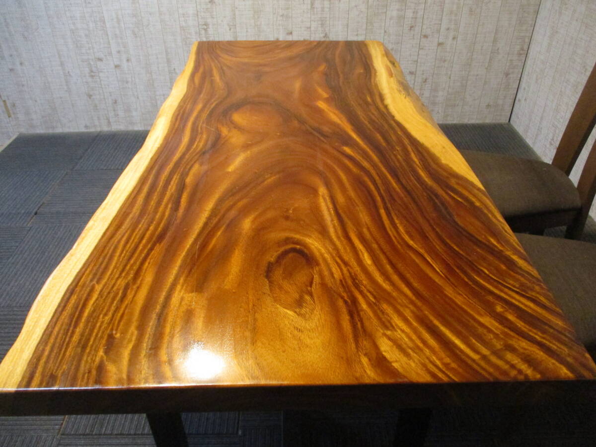 モンキーポッドの一枚板無垢のテーブルです。幅広サイズです。杢のデザインが魅力です。両面ご使用になれます。この幅広サイズが人気です。