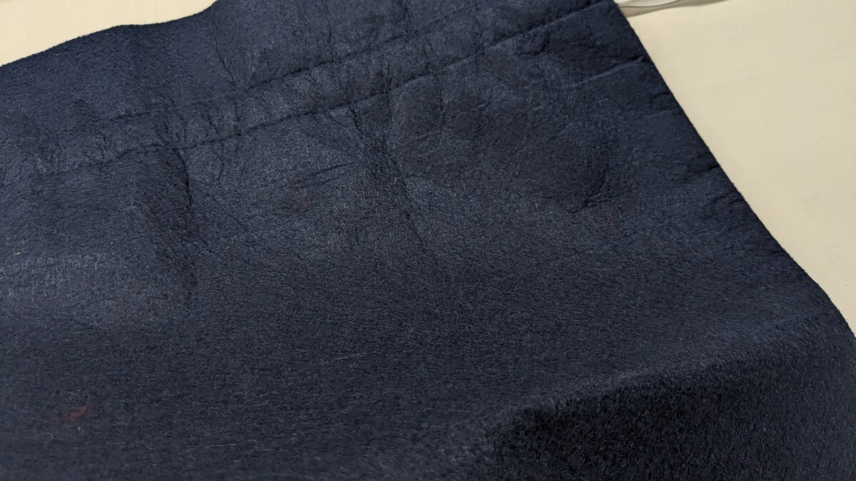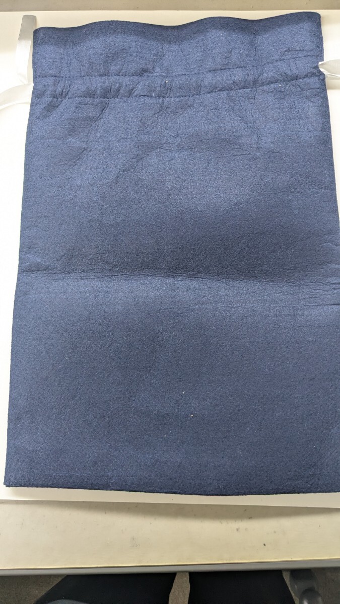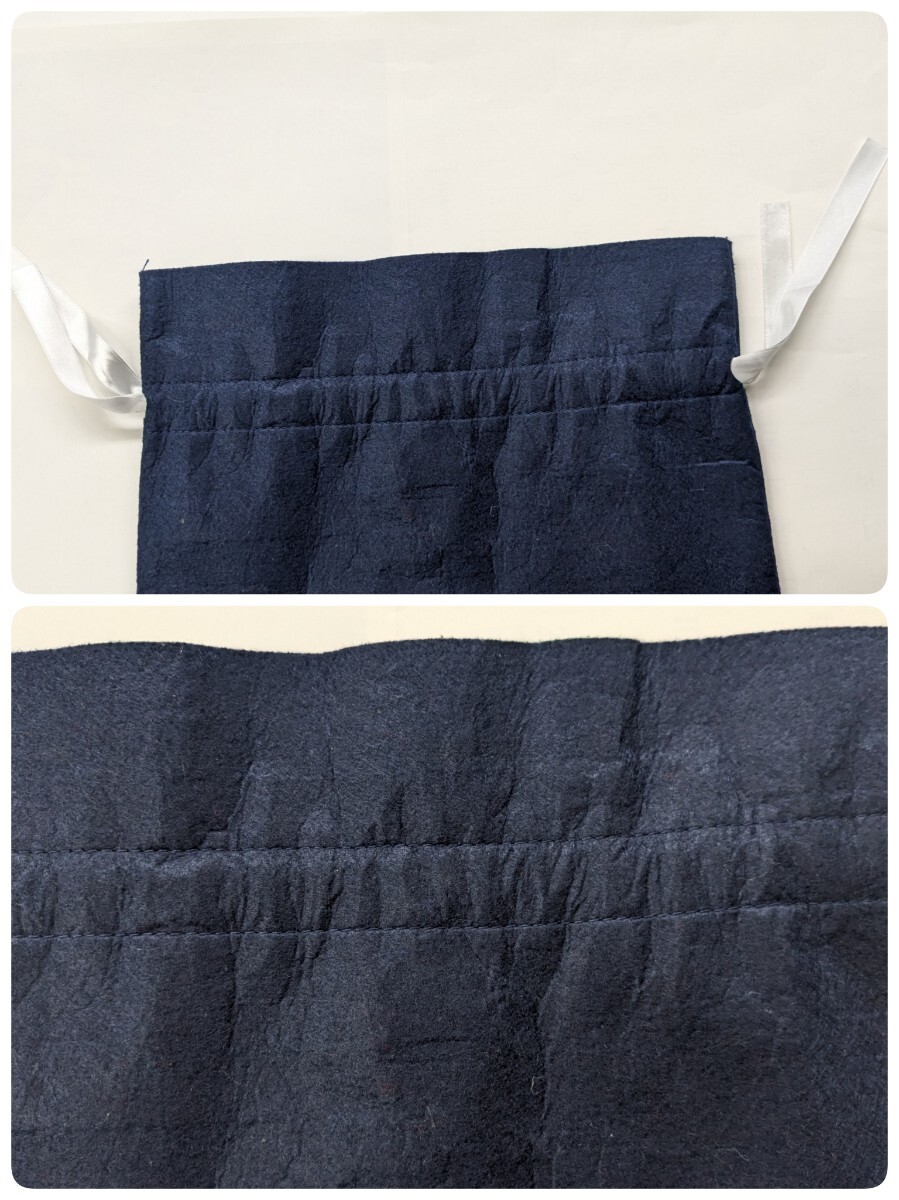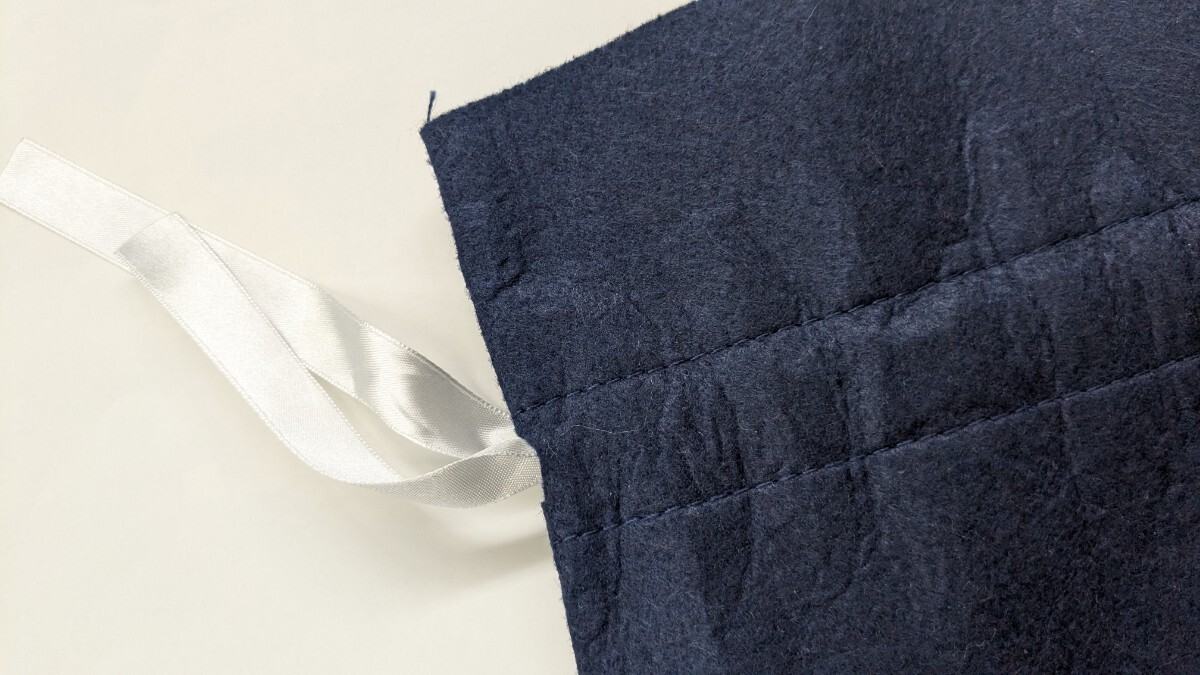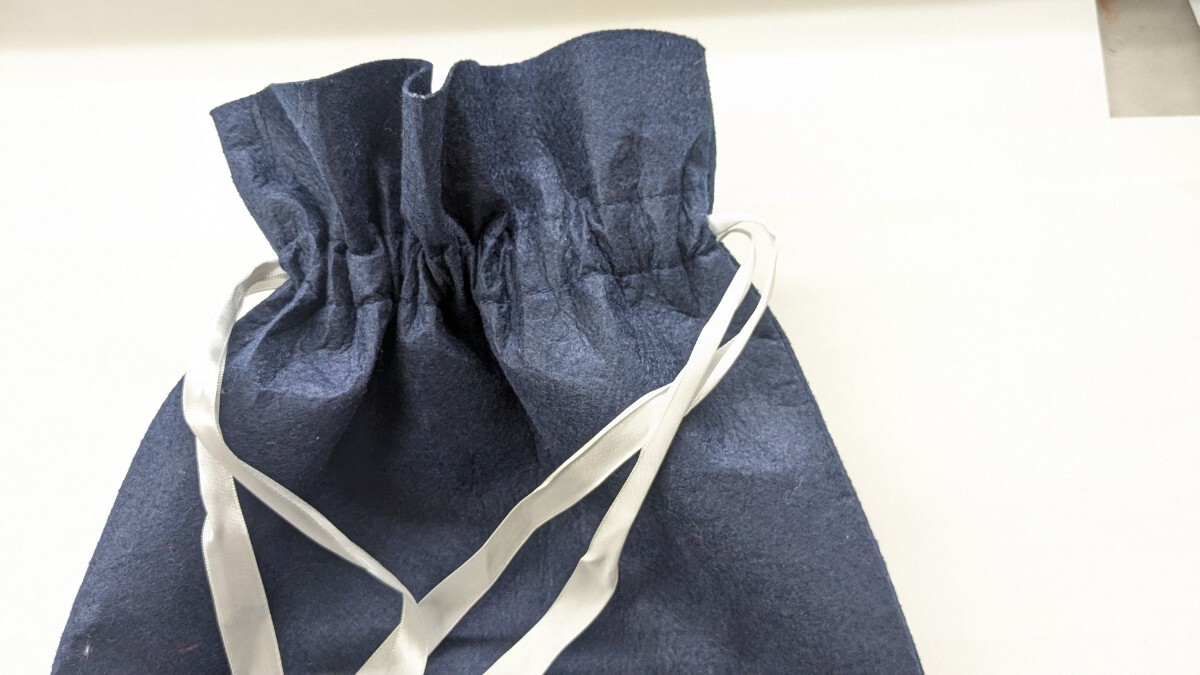 素材は、フェルトの少し硬めような生地で、巾着のように絞るのには、生地が少し硬いです。