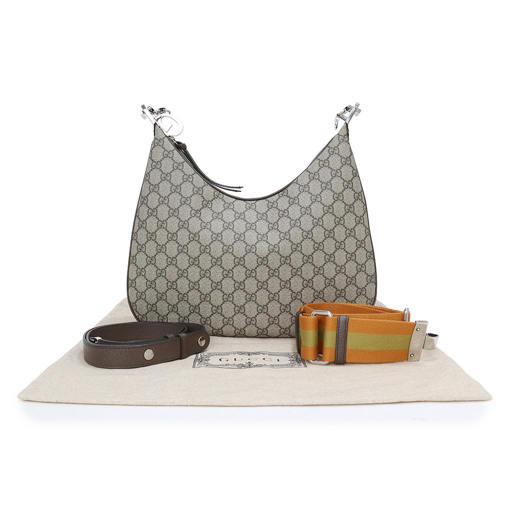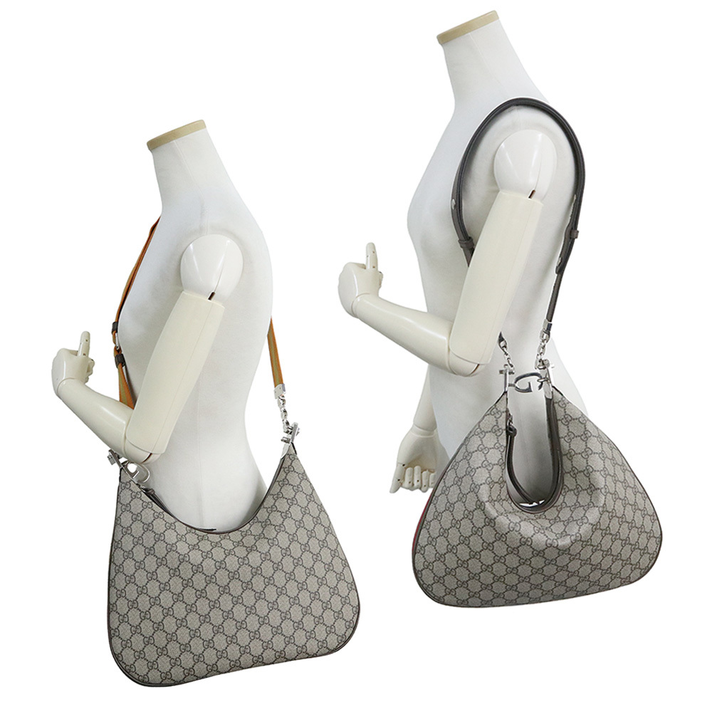 ハーフムーンシェイプが印象的な「アタッシェ ショルダー」。Gシェイプのフック クロージャーがアクセントになっています。ソフトな素材を組み合わせたグッチの伝統的なハードウェアが洗練されたヴィンテージの魅力を放ちます。ショルダーストラップを付け替えたりバッグの形を変えることができるので、その日の気分で様々な持ち方が楽しめるバッグです。