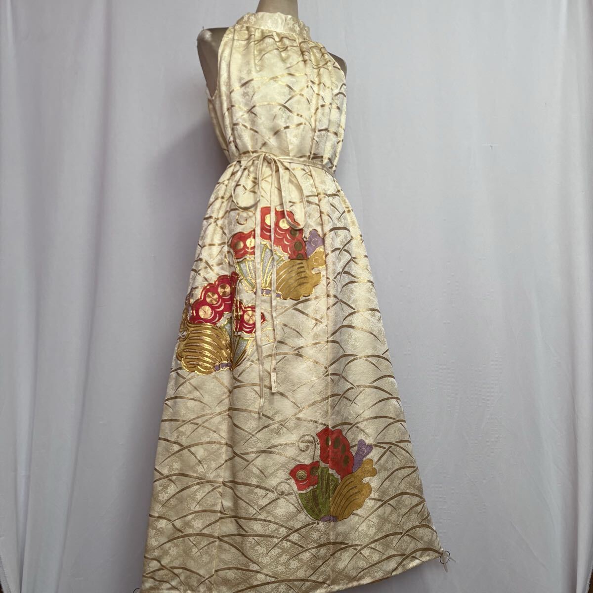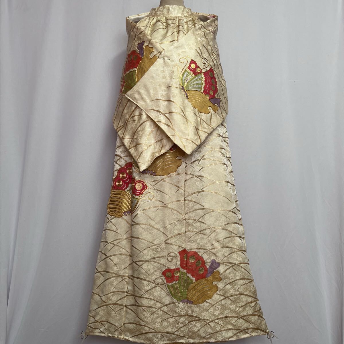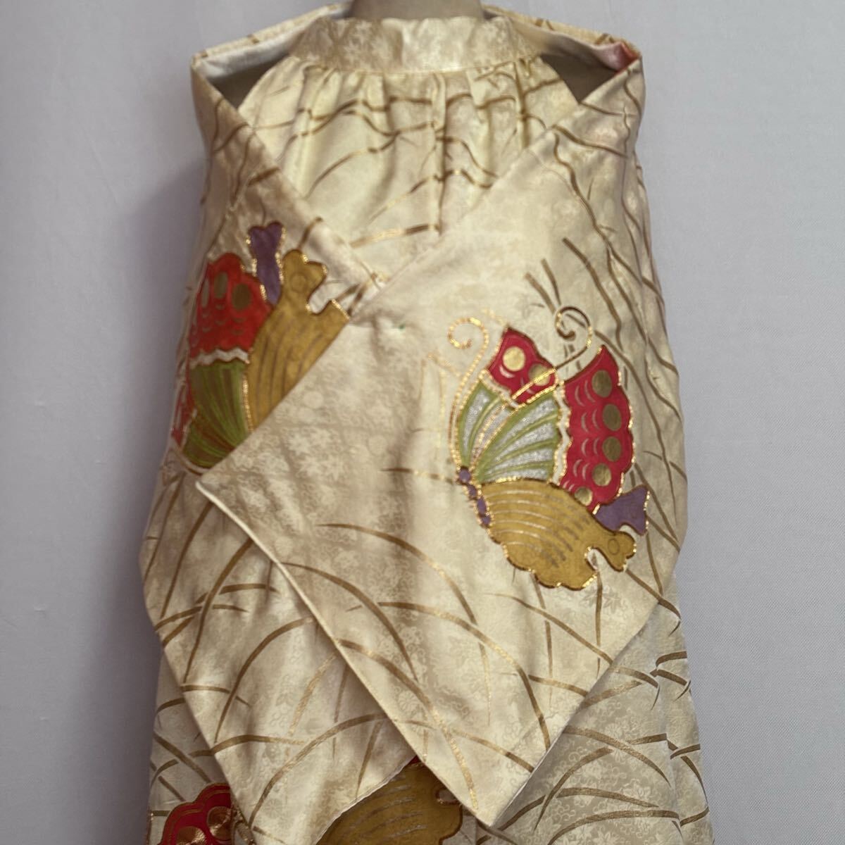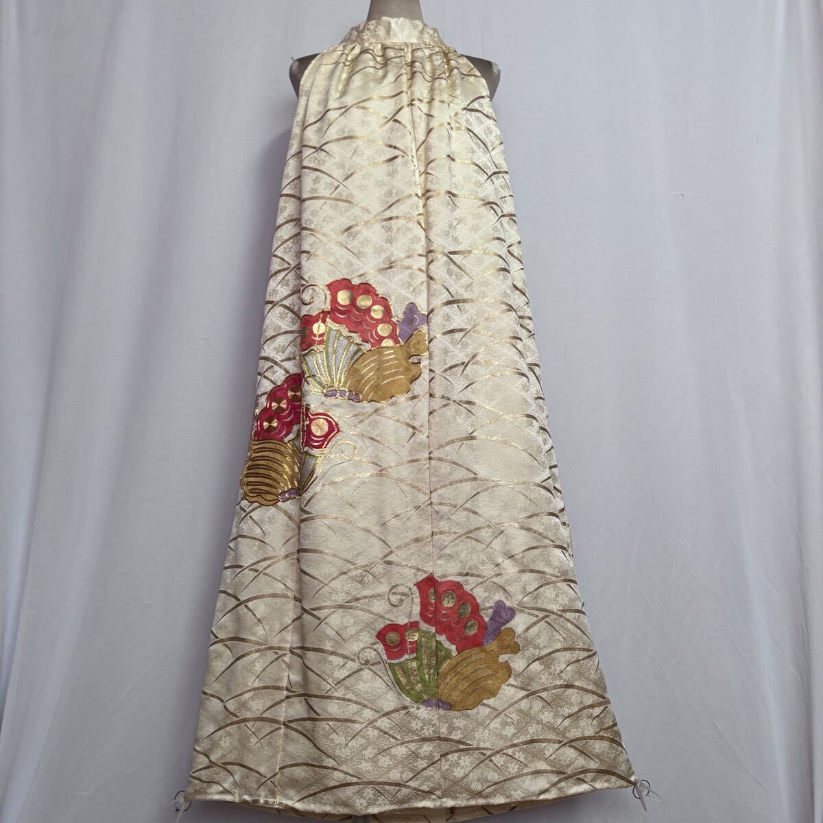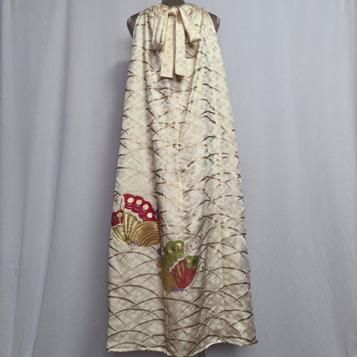 ★23★生成色振袖ホルターネックロングワンピース・ストール★金箔舞蝶々駒刺繍★L★正絹★多少難あり
