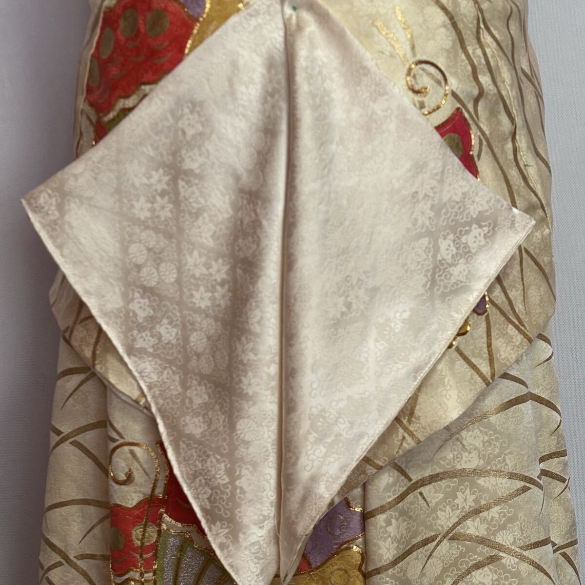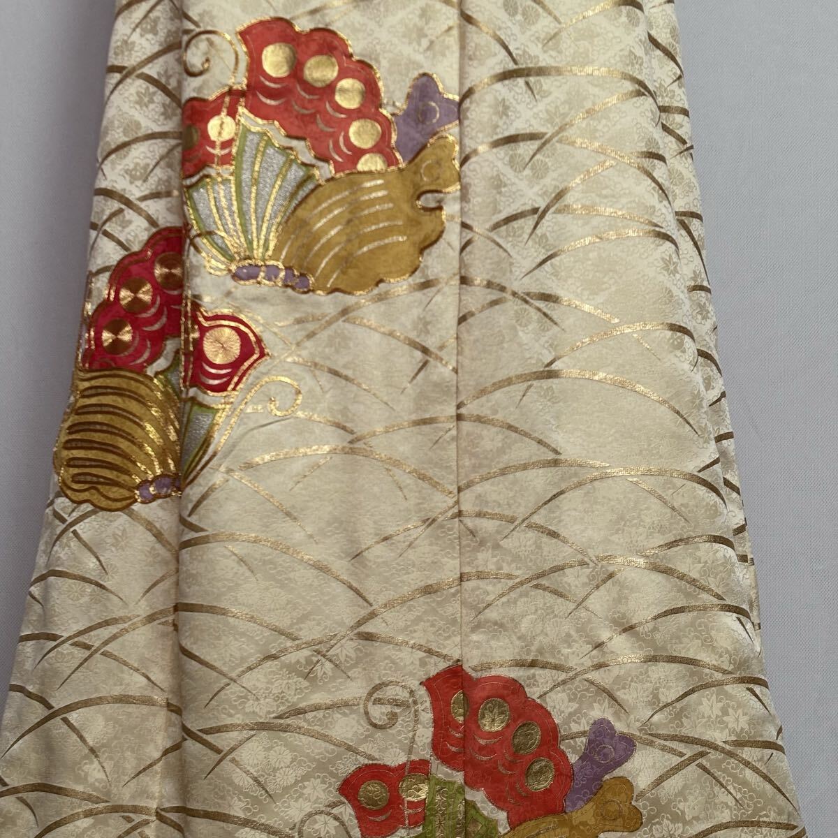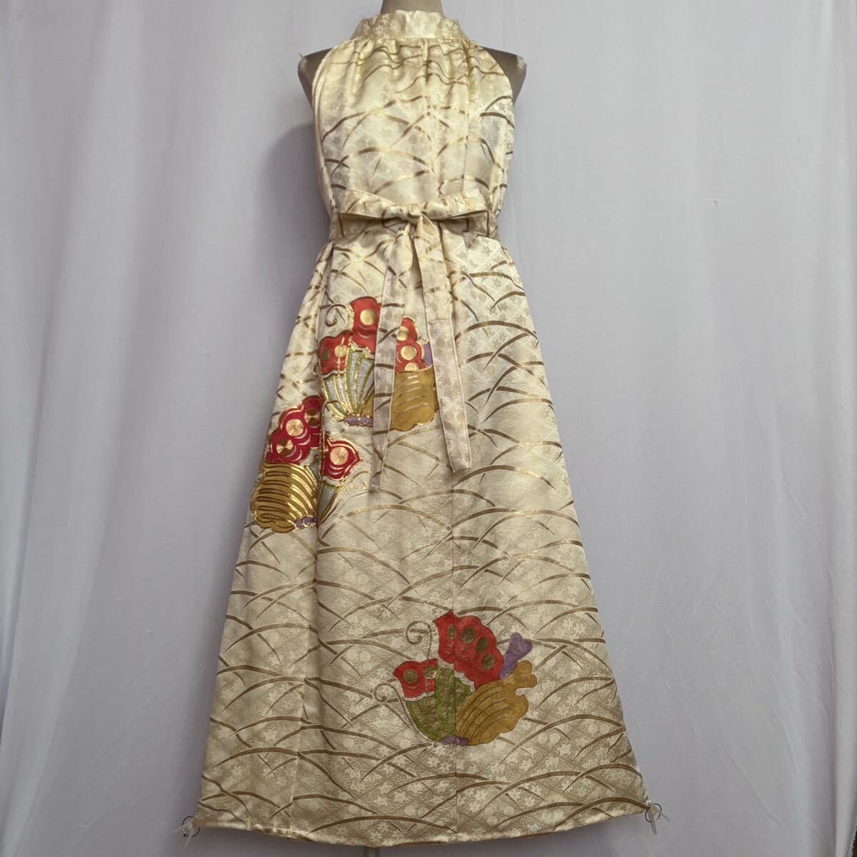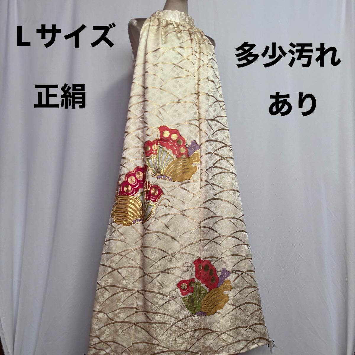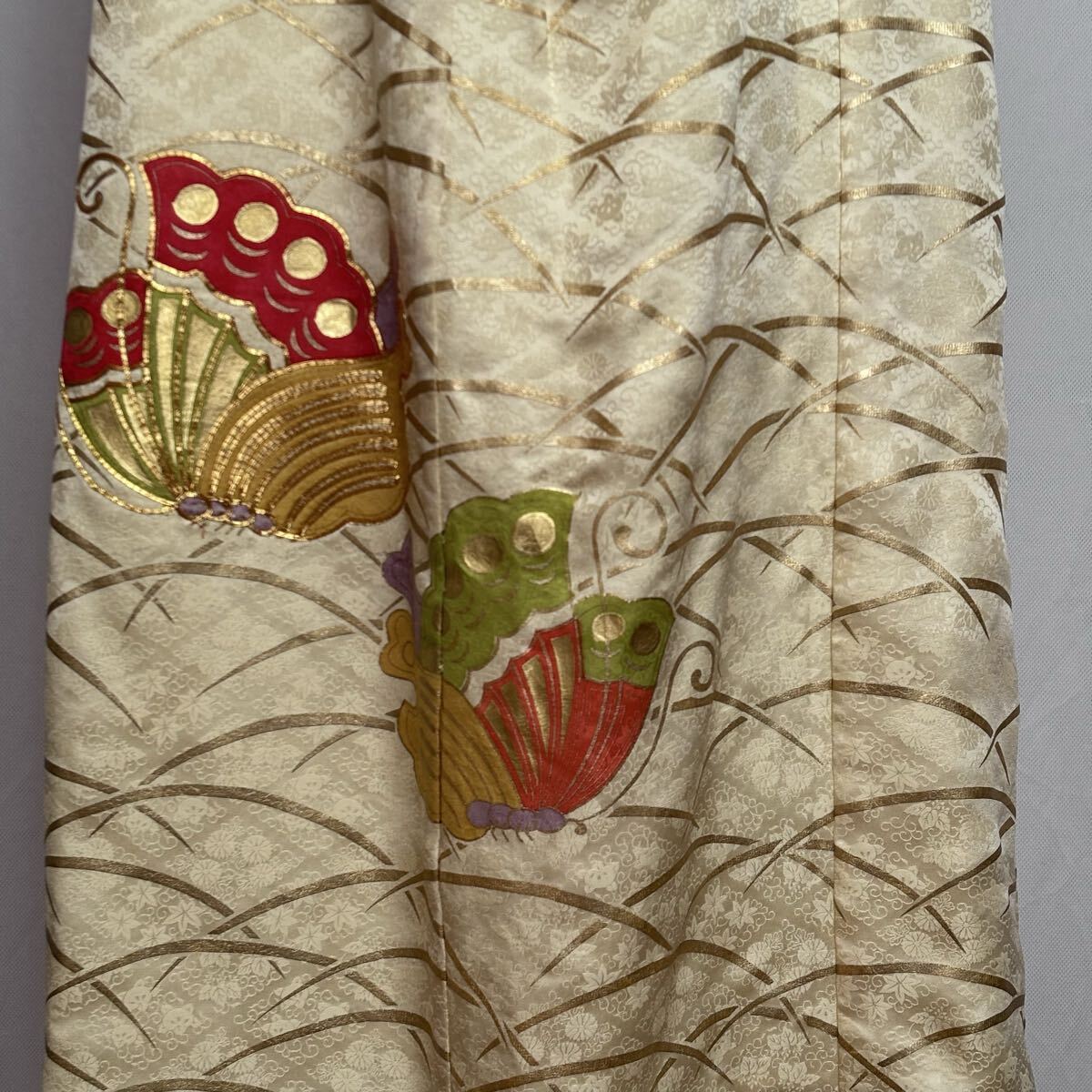 ★23★生成色振袖ホルターネックロングワンピース・ストール★金箔舞蝶々駒刺繍★L★正絹★多少難あり