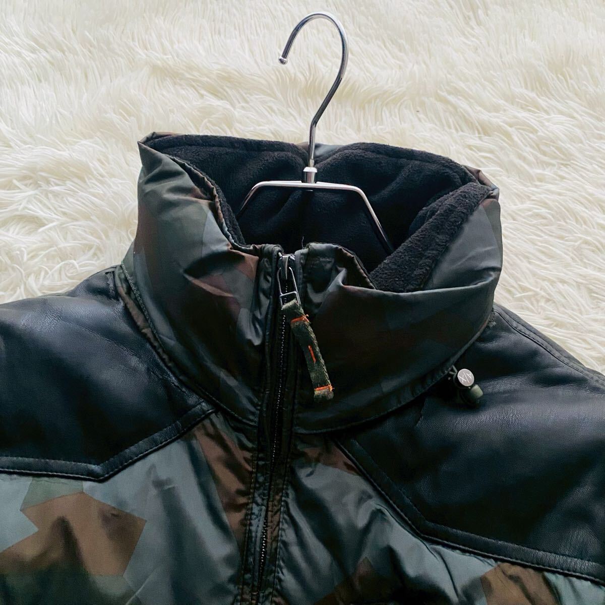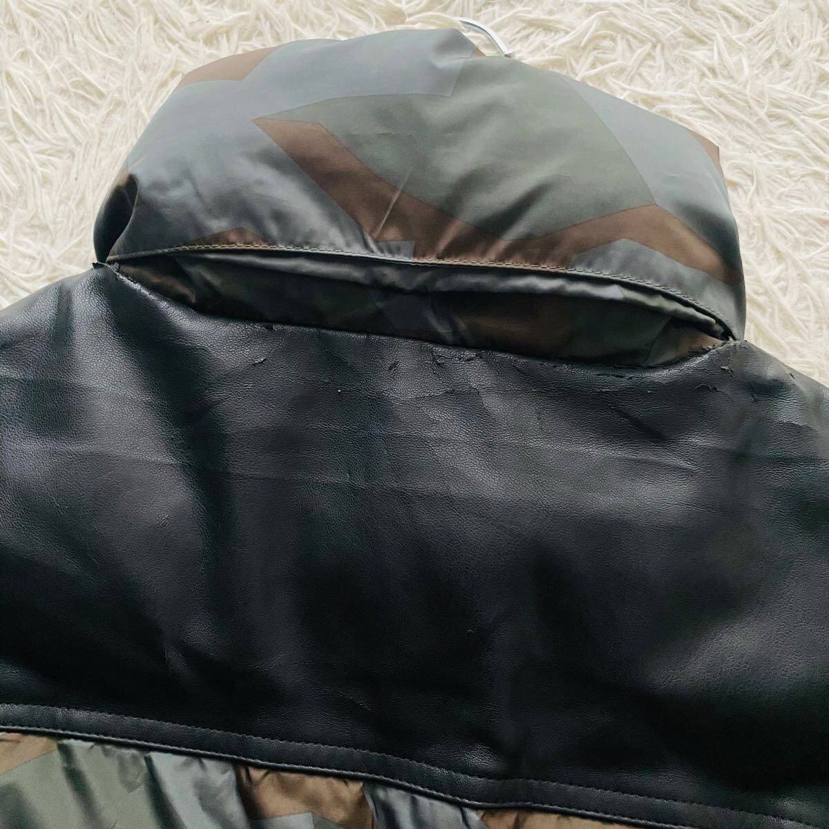 襟とレザーの継ぎ目部分にうっすらひび割れや剥がれがありますが、襟に隠れる部分のため目立ちません(6枚目参照)。その分お安く出品しています。