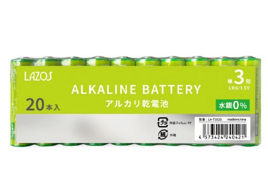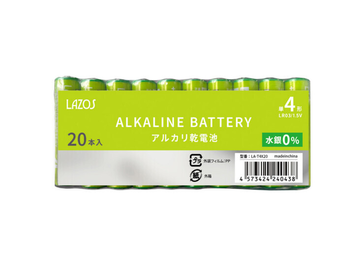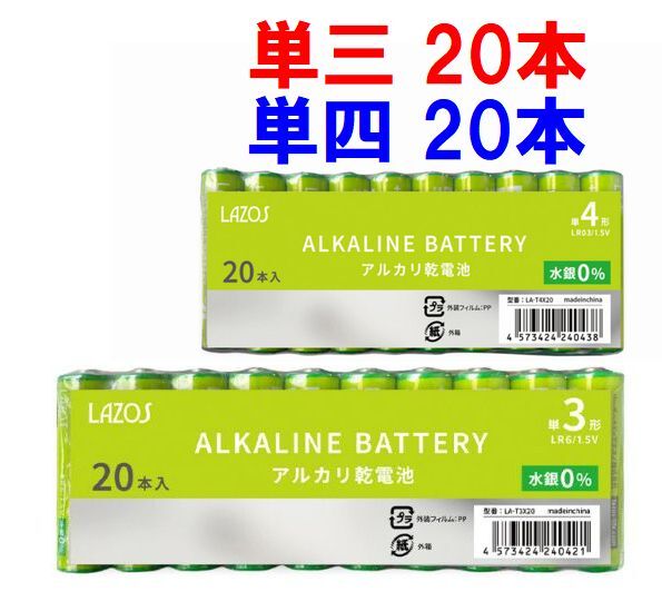 LAZOS 単3 20本 + 単4 20本 アルカリ乾電池 計40本セット
