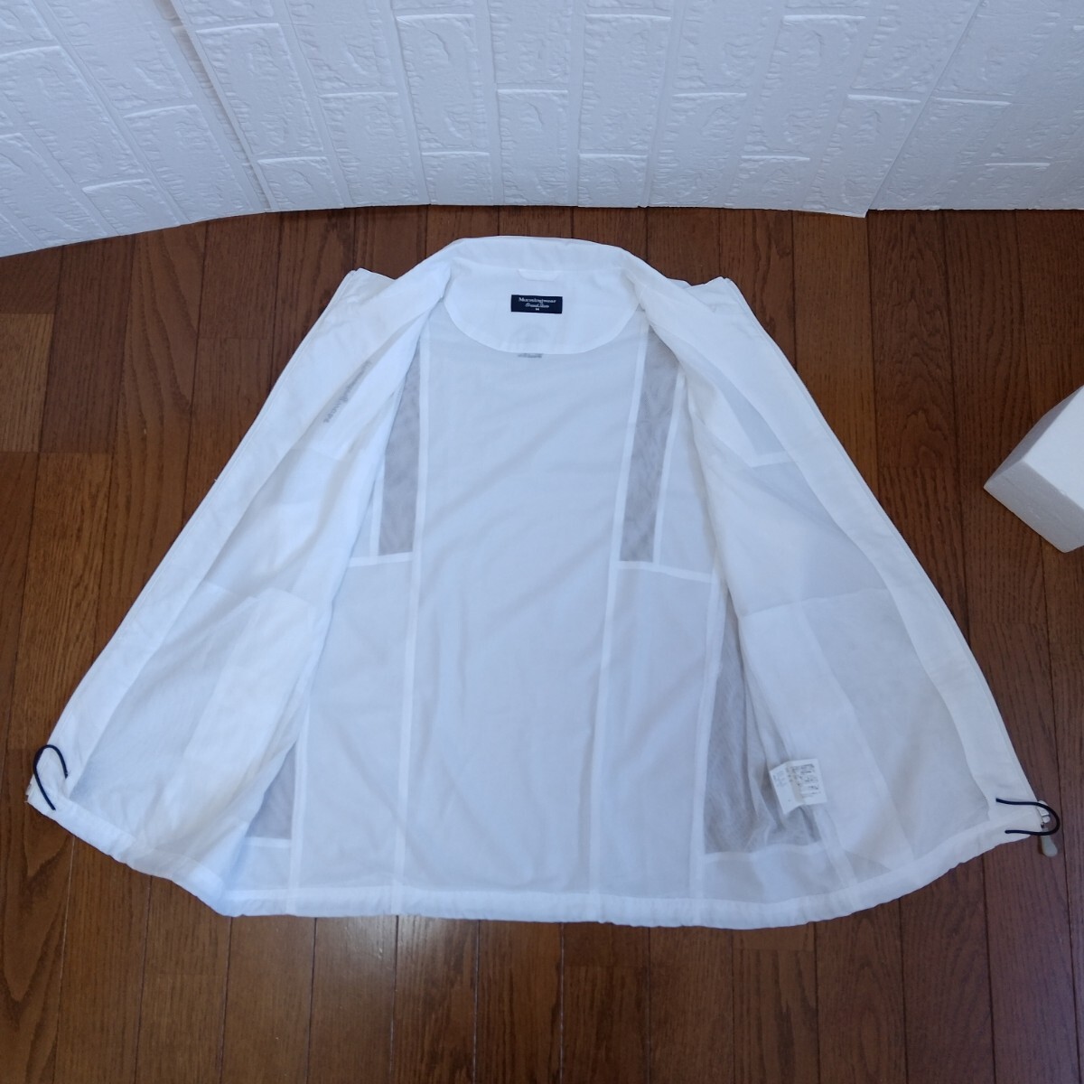 Munsingフルジップサマーベストです、特徴は涼しさを感じる白、肩の下とサイドはメッシュ素材で風通しの良いサマーベストです、左胸に縦にマンシングの刺繍入、首後はグレーのステッチと黒のマンシングのロゴ刺繍、裾もゴムが有り絞れる形になっています。