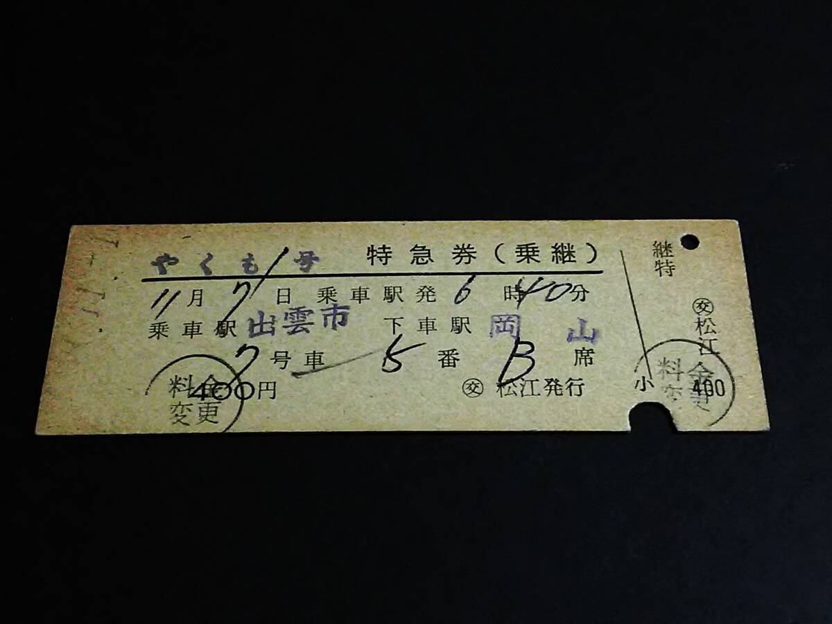 【特急券(乗継)(D型)】 「やくも1号」出雲市→岡山 S49.11.1