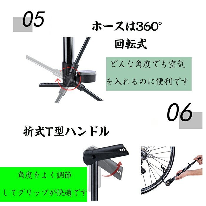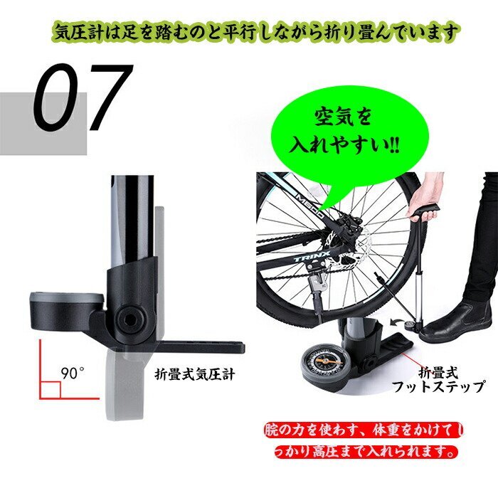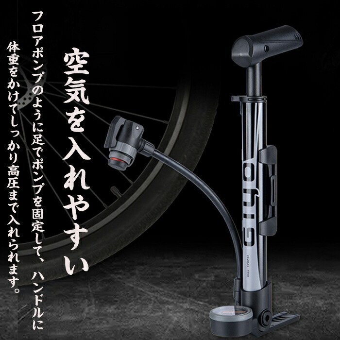 【空気を入れやすい】フロアポンプのように足でポンプを固定して、ハンドルに体重をかけてしっかり高圧まで入れられます。