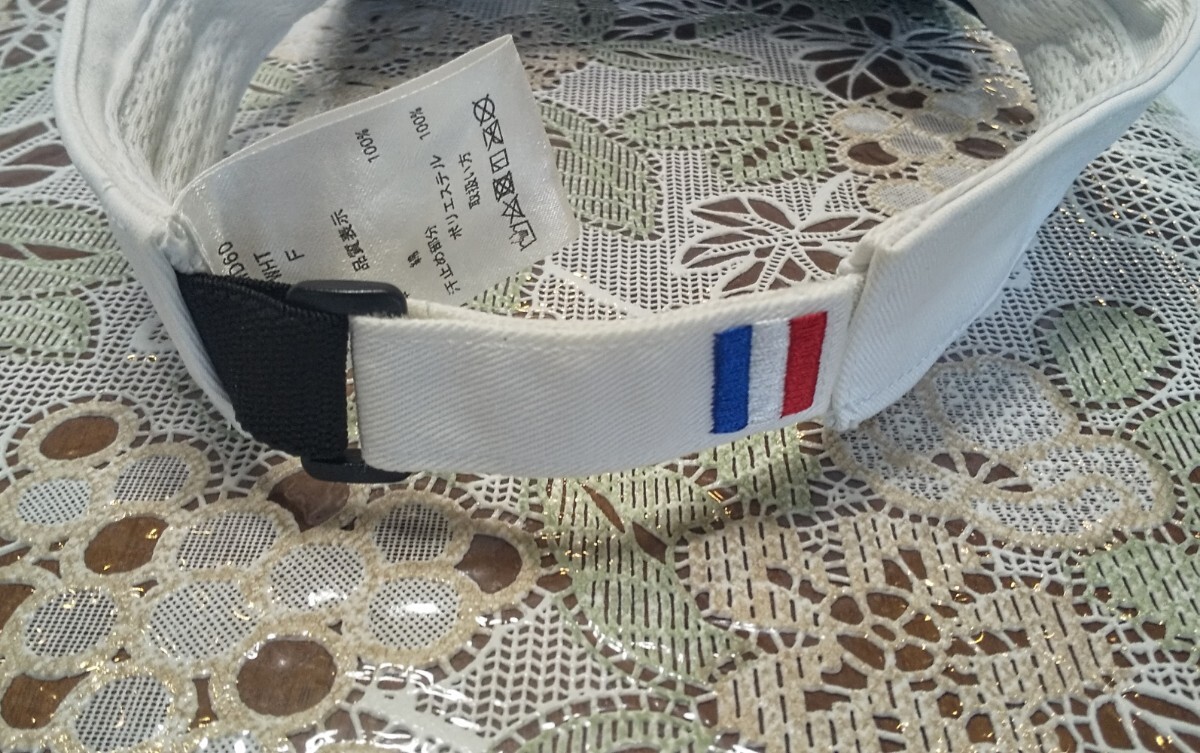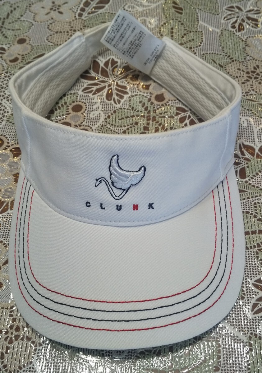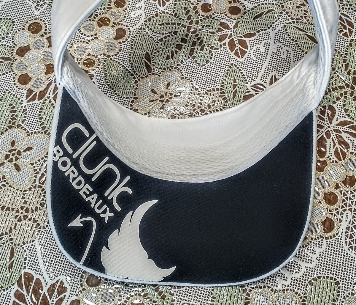 ホワイトのCLUNKバイザー、BORDEAUXモデル、トリコロールストライプ付き。