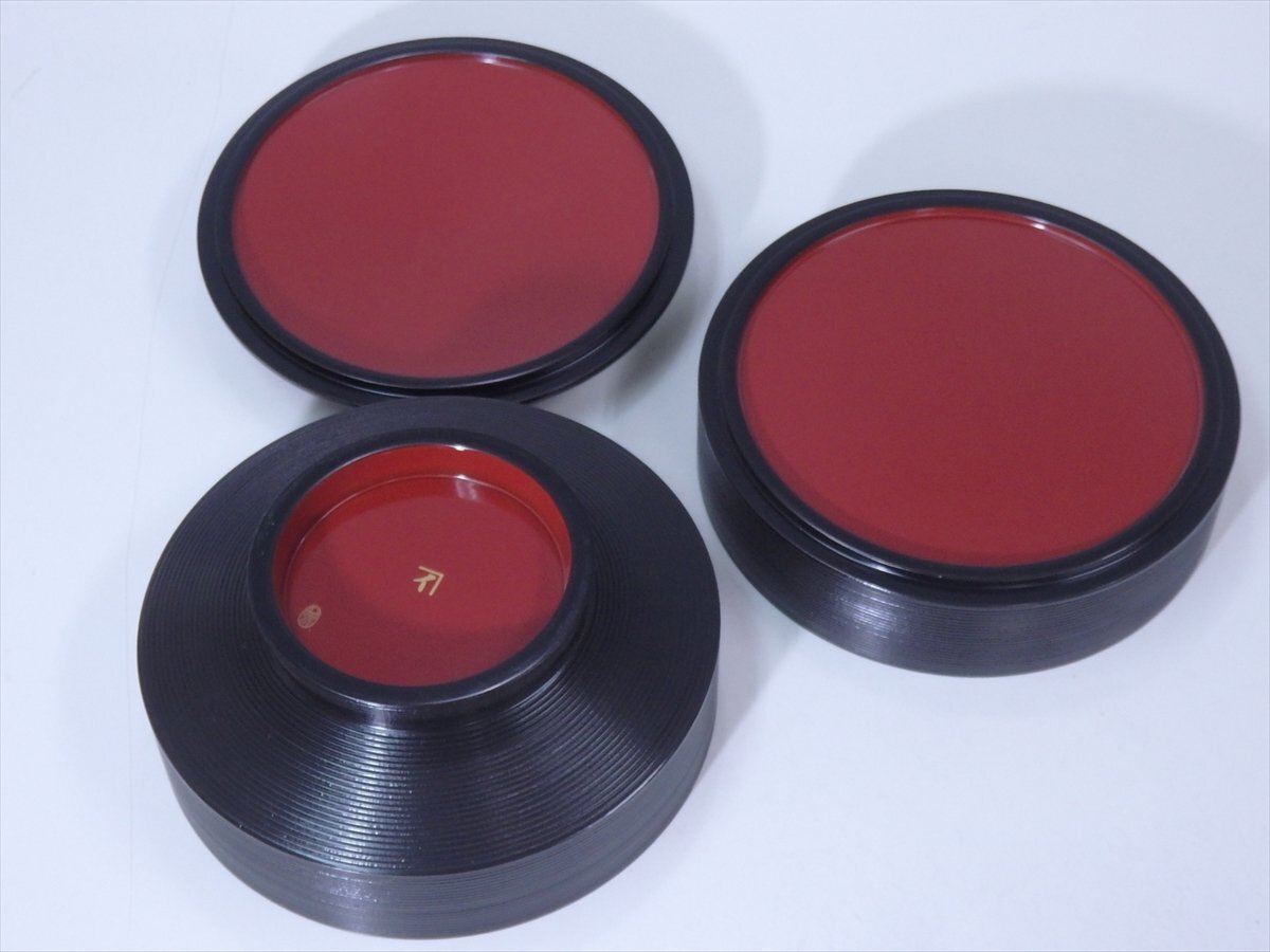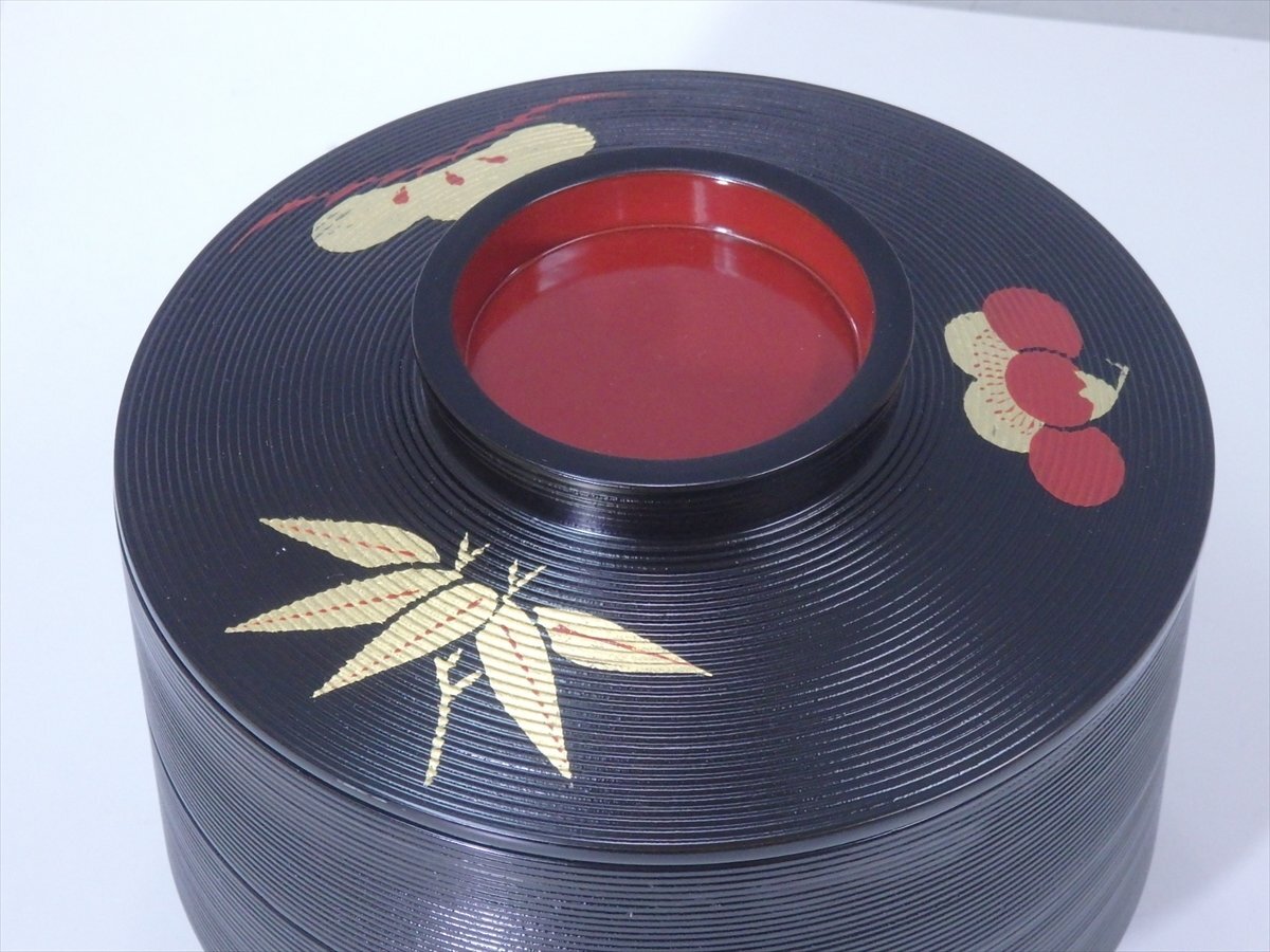 【管理番号5-1022202-8 スタッフコメント:iy】  ☆黒、筋目、松竹梅の金彩で内朱、木製。底に象彦のマークと、もう一つマークがあります。ほとんど使用感はなく、キレイな状態です。