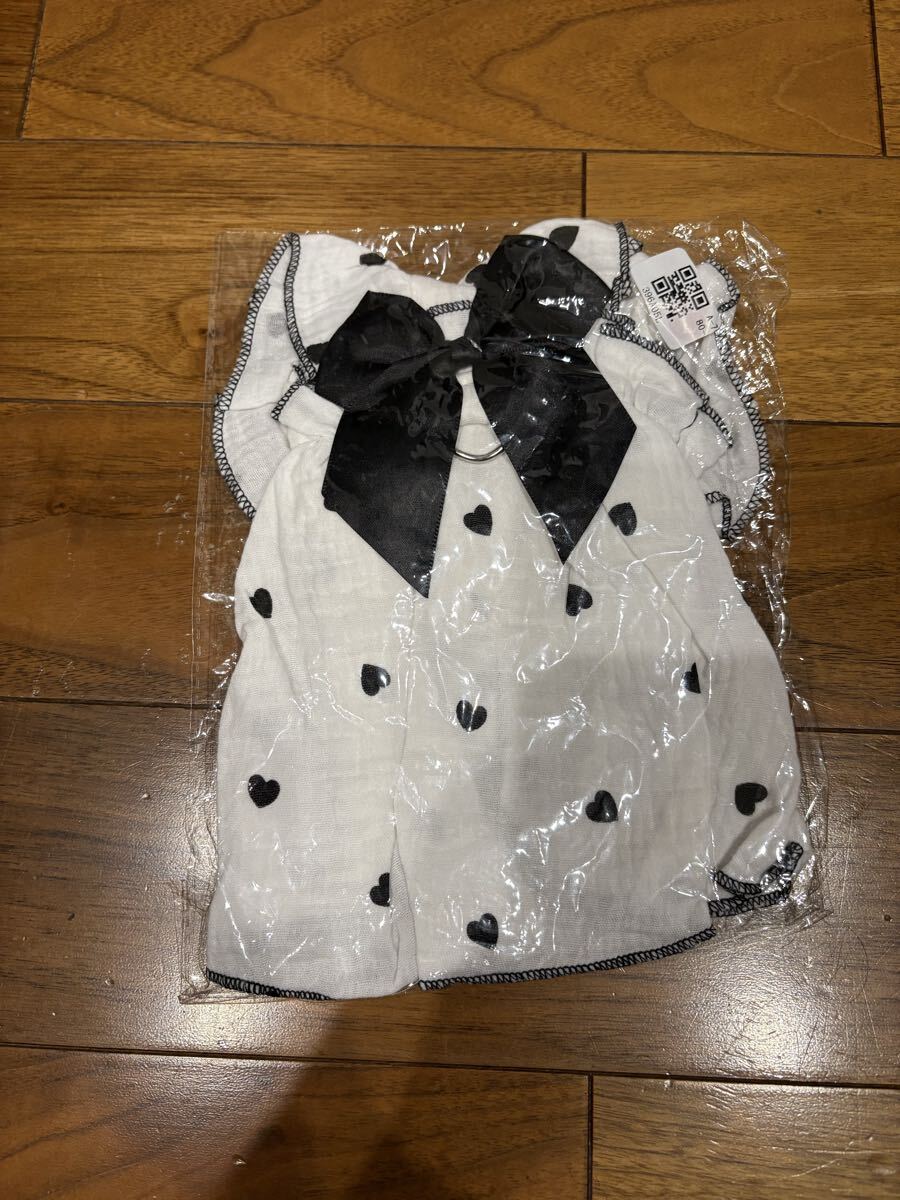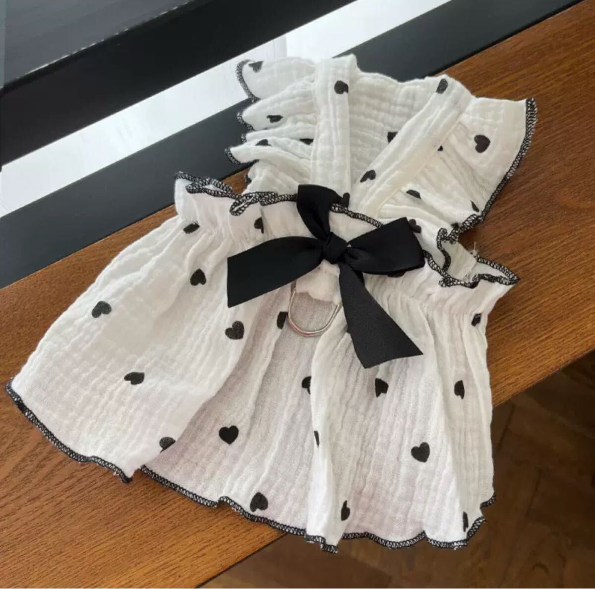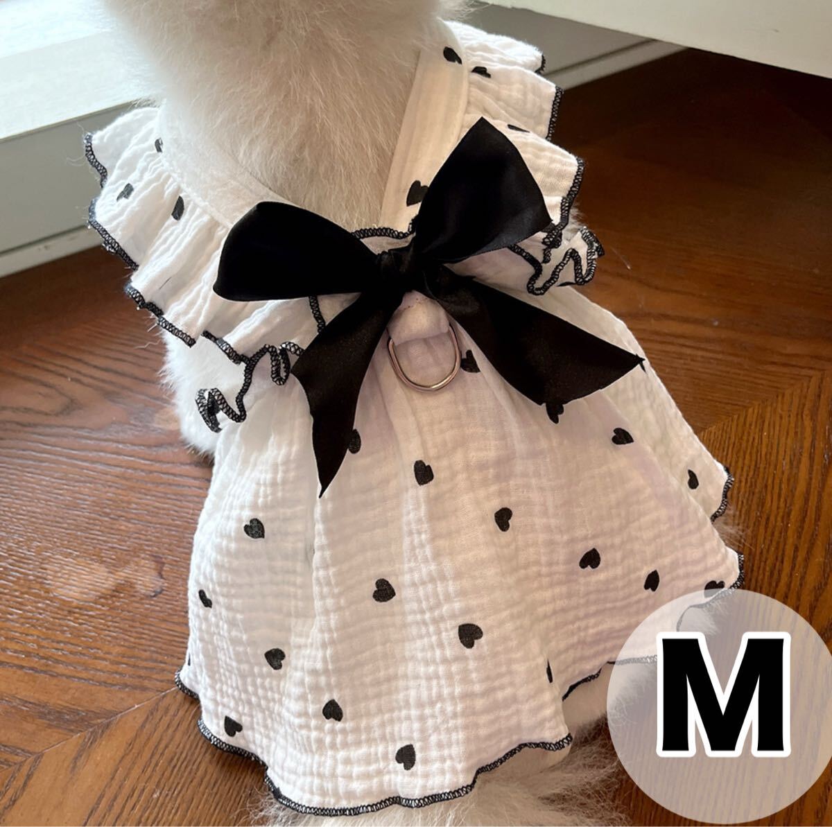 白地に黒いハート柄のフリル付き犬服、Mサイズ