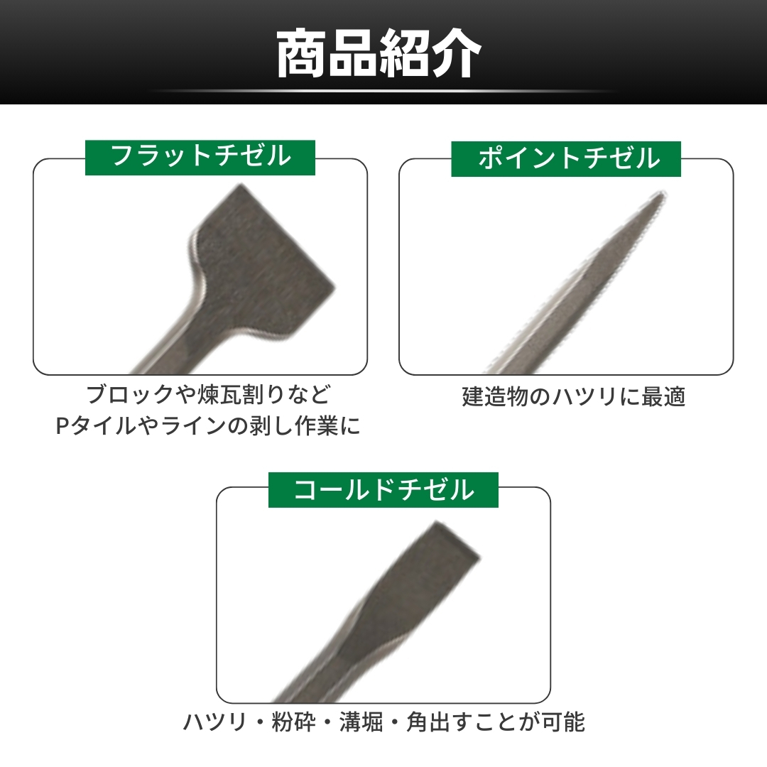 | 商品説明 | ご覧いただきありがとうございます! ●商品説明 電動ハンマー用チゼル タガネ 3本セットです。 幅広い種類の工具に対応可能です。 構造物へのハツリや破砕、溝切り、角出し作業におすすめ☆ コンクリート、ブロック、レンガ、モルタル、スレート、ALC、日本壁、大理石、陶器タイルなどに! ●セット内容 ・フラットチゼル×1本(全長:約250mm、直径:約10mm、重さ:約265g) ブロックや煉瓦割りなどPタイルやラインの剥し作業に ・ポイントチゼル×1本(全長:約250mm、直径:約10mm、重さ:約220g) 建造物のハツリに最適 ・コールドチゼル×1本(全長:約250mm、直径:約10mm、重さ:約230g) ハツリ・粉砕・溝堀・角出すことが可能 ●商品詳細 カラー:シルバー 重さ:約715グラム/3本 規格:SDSプラス 素材:40crタングステン鋼 数量:各種1本、3本セット ●お支払い方法 Yahoo!かんたん決済 ●発送について 【クリックポストで発送します】 発送日 :お支払い後1~3日以内 到着目安:発送後2~4日程度 ※商品はポストに投函されます ※遠方の方はもう少しかかる場合もございます 【配送方法の変更はできません】 ●注意事項 ・落札後は期限内にお支払いください ・取扱説明書の付属はございません ・商品画像の転載や説明文のコピーはお止め下さい 〇初期不良は対応しますので、何かあれば「取引完了前に」ご連絡下さい |