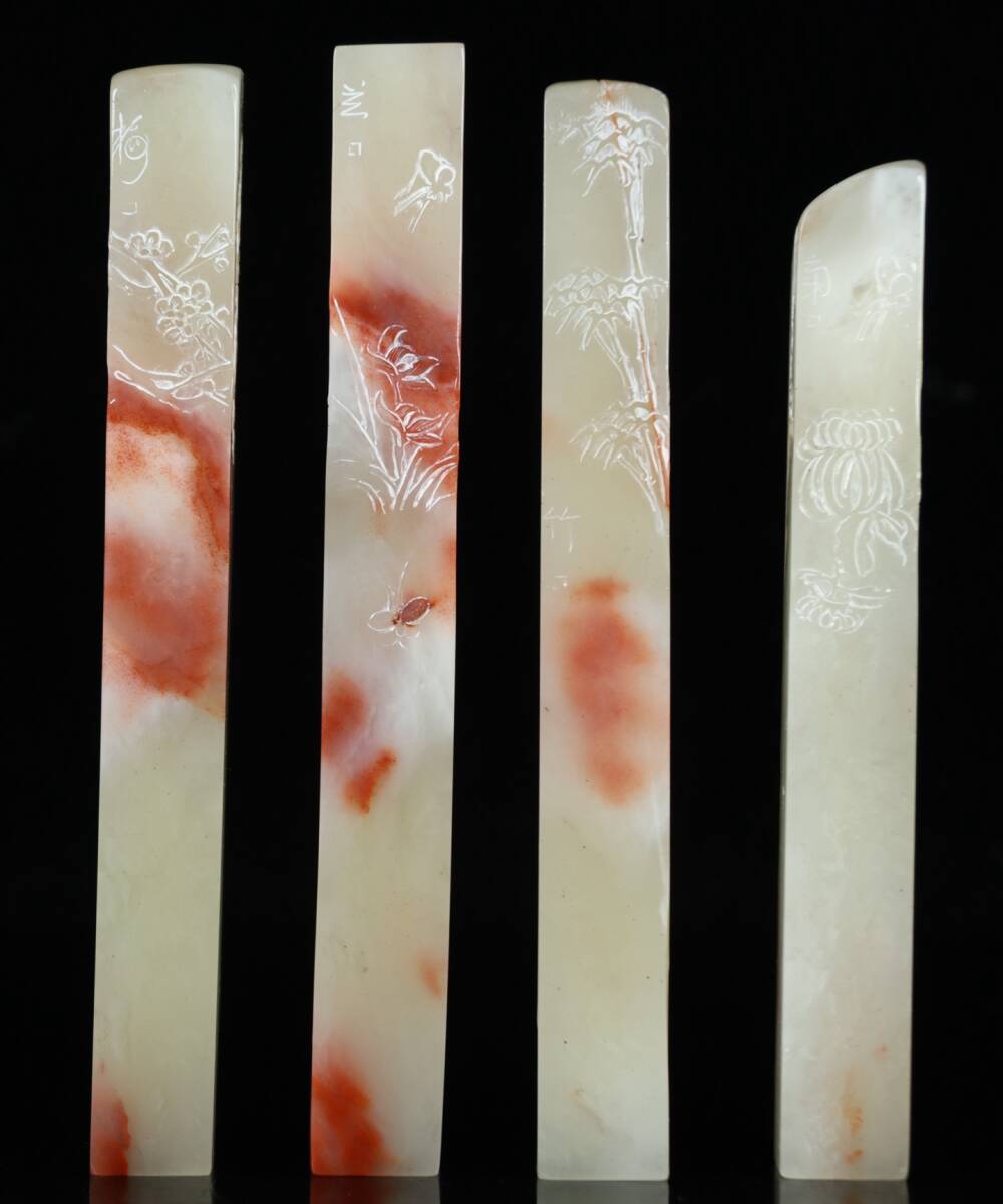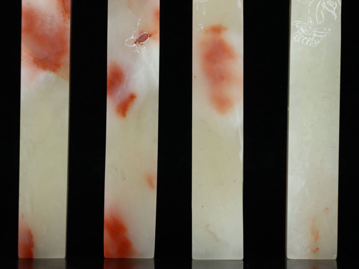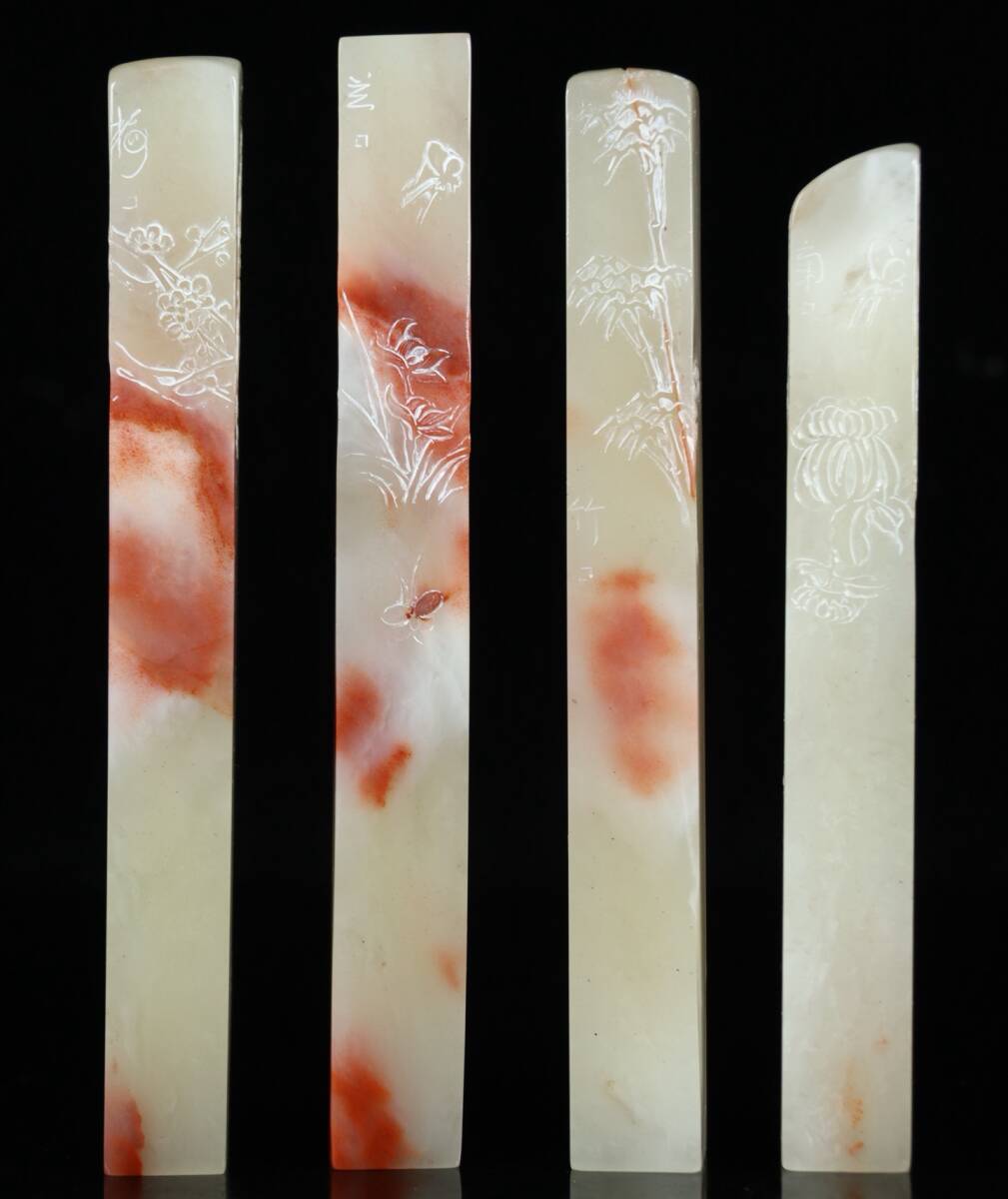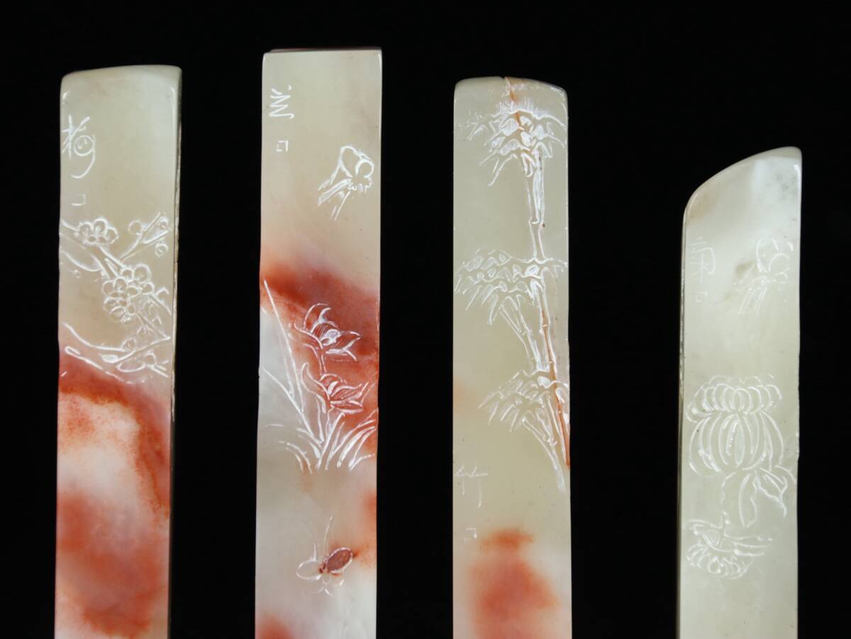旧蔵 清 寿山石 彫刻 梅蘭竹菊套章 天然石 手彫 篆刻 古印材 極細工 中国古玩 骨董品 古美味 210
