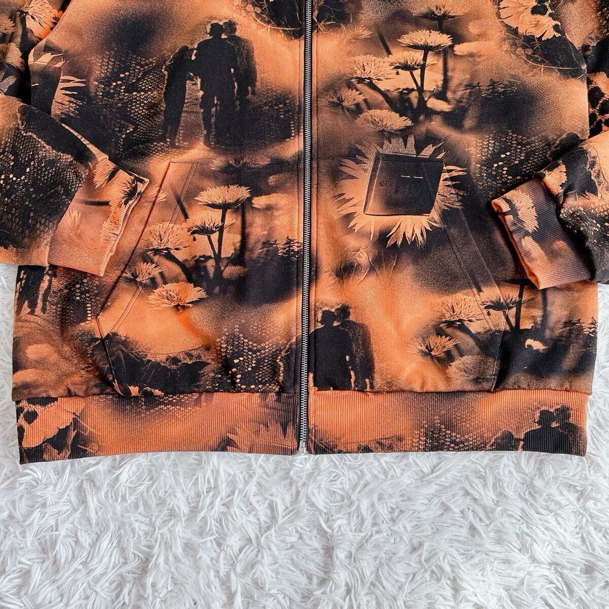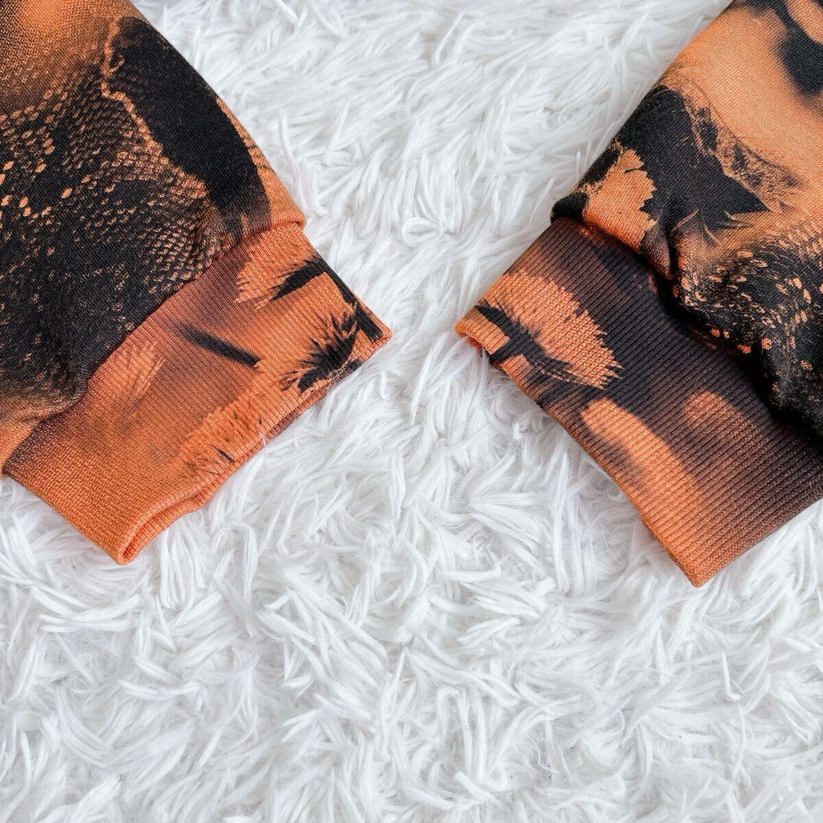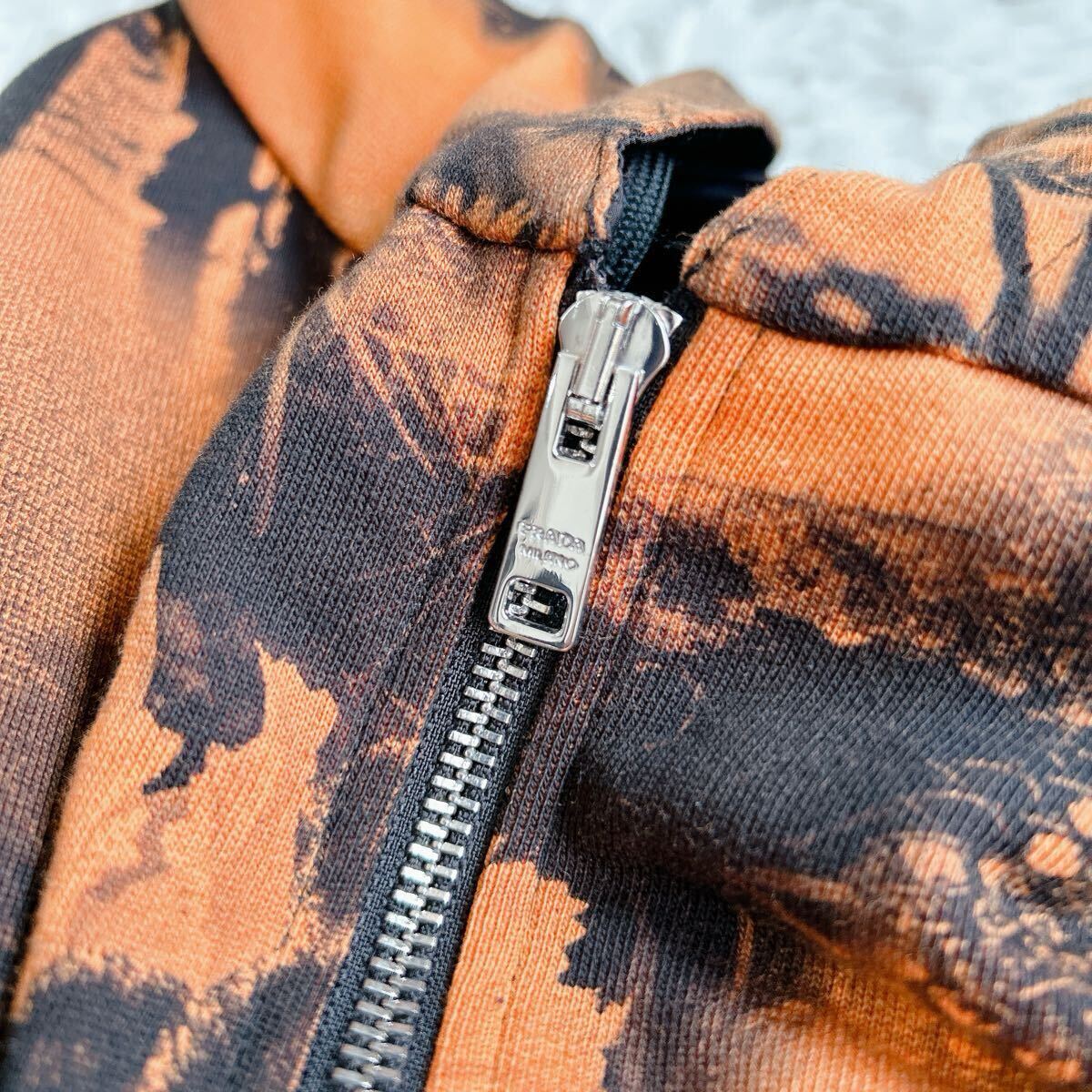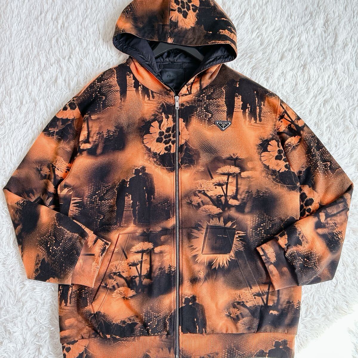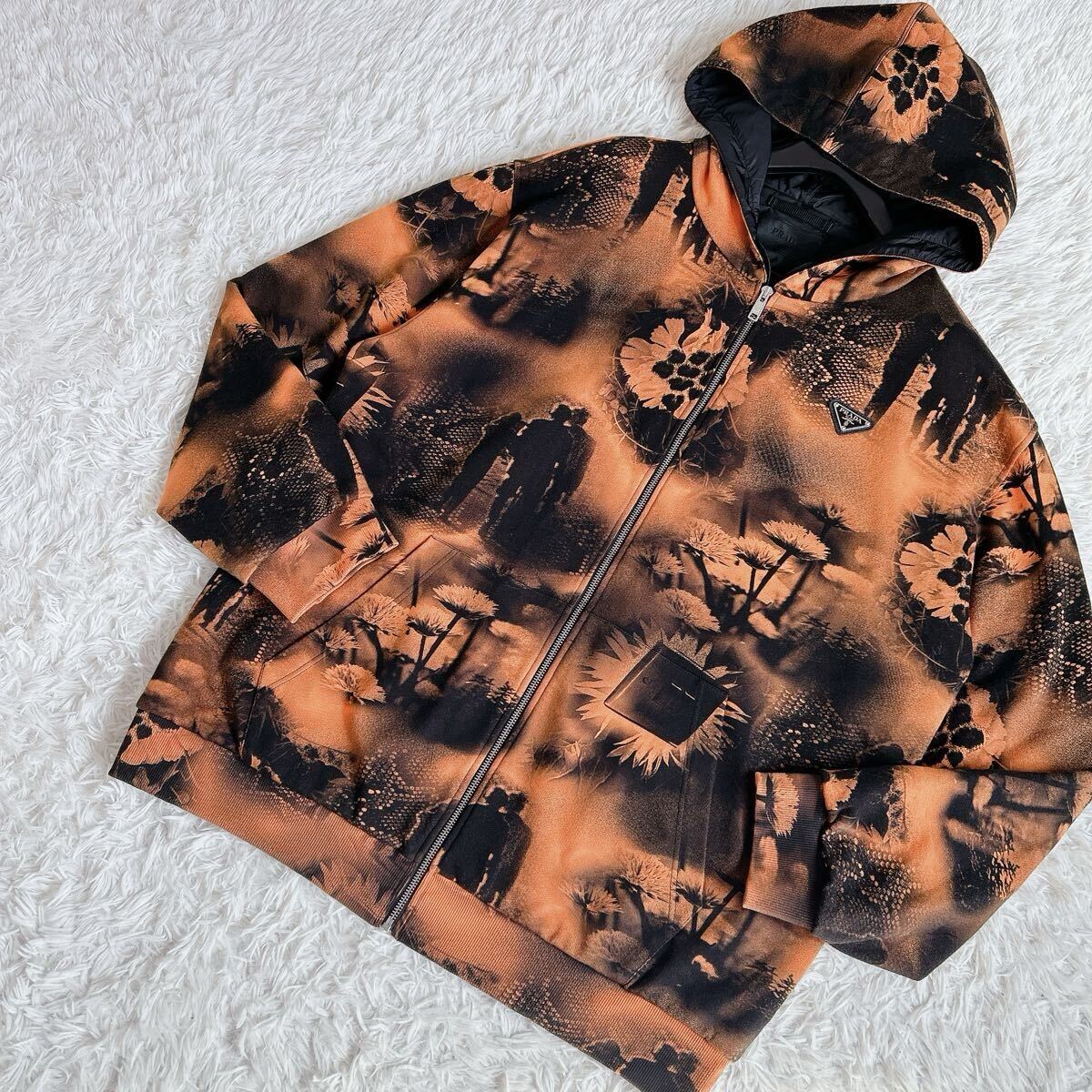 大胆なオレンジ×ブラックのグラフィック柄が印象的な現行モデル。軽量で滑らかな質感のナイロン素材を使用し、内側は総裏地仕立てで保温性も高く、秋冬に最適です。胸元にはトライアングルロゴプレート付き。