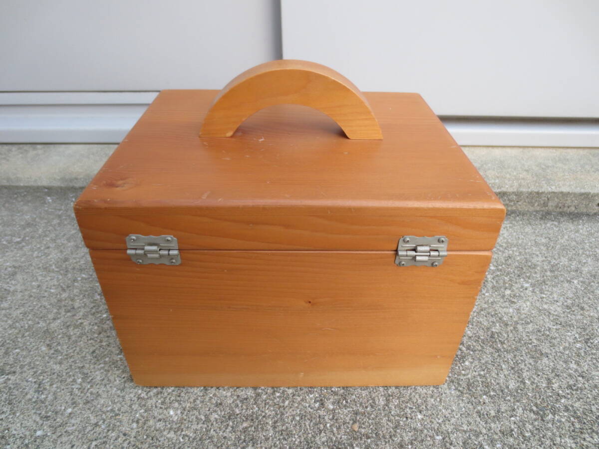 木製の箱です。サイズ約 17X20X25センチ(持ち手部分除く)