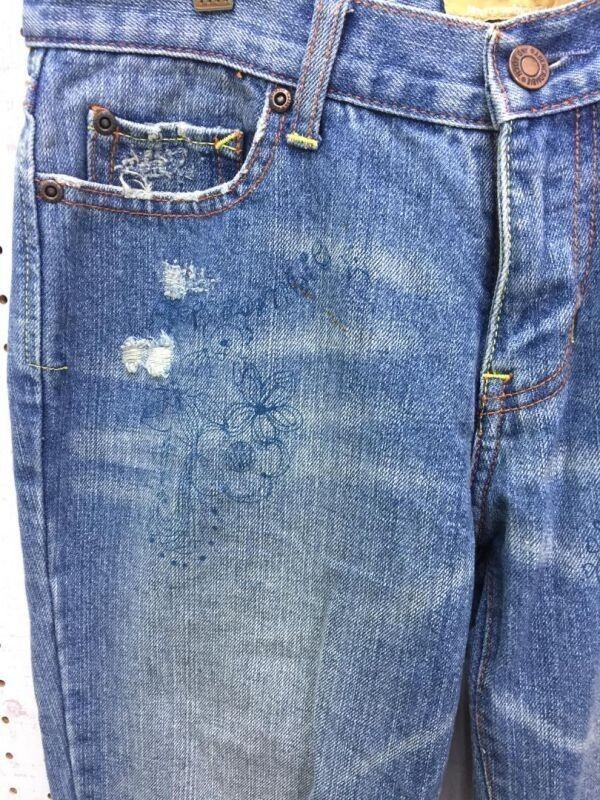 アバクロンビー&フィッチ Abercrombie&Fitch ブーツカット フレア ダメージ加工 フラワードローイング デニム ジーンズ レディース 6R 青