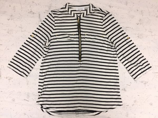 カルバンクライン Calvin Klein キレカジ ボーダー バンドカラー 七分袖カットソー レディース レーヨン95% ポリウレタン5% M 白黒