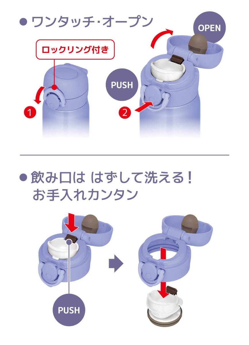 ●ワンタッチ・オープンで片手でも扱いやすいケータイマグ。丸みのあるフォルムが特徴。 ●ステンレス製魔法びん構造だから高い保温・保冷力 ●同容量帯で最高クラスの軽さとコンパクト感 ●飲み口ははずして洗えて、お手入れカンタン ●スポーツ飲料OK(※温めたスポーツ飲料は入れないでください。) ●丸洗いOK (※本体は水中に放置しないでください。)