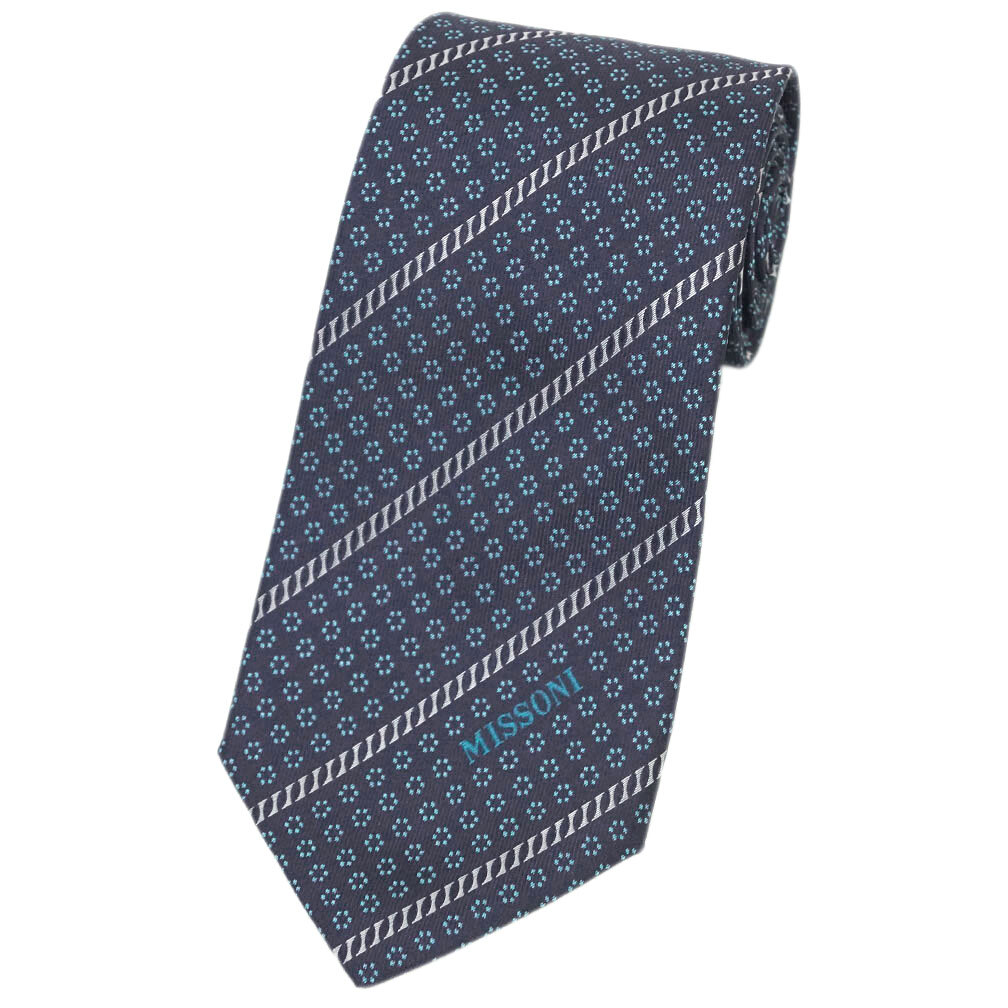 ミッソーニ ブランド ネクタイ MISSONI メンズ ジャガード ストライプ フラワー 花 シルク 100% ネイビー マリンブルー 紺 青 水色